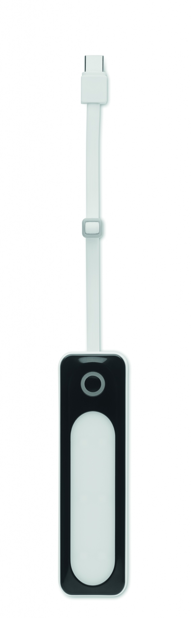 5000 mAh Powerbank. ABS-Gehäuse. Mit COB Leuchte (6 LEDs) mit 4 Lichteinstellungen. Ausgangsstrom DC5V/2A 1x Typ A und 1x Typ C in/out. Inkl. integriertes USB-Kabel mit Typ-C-Stecker.