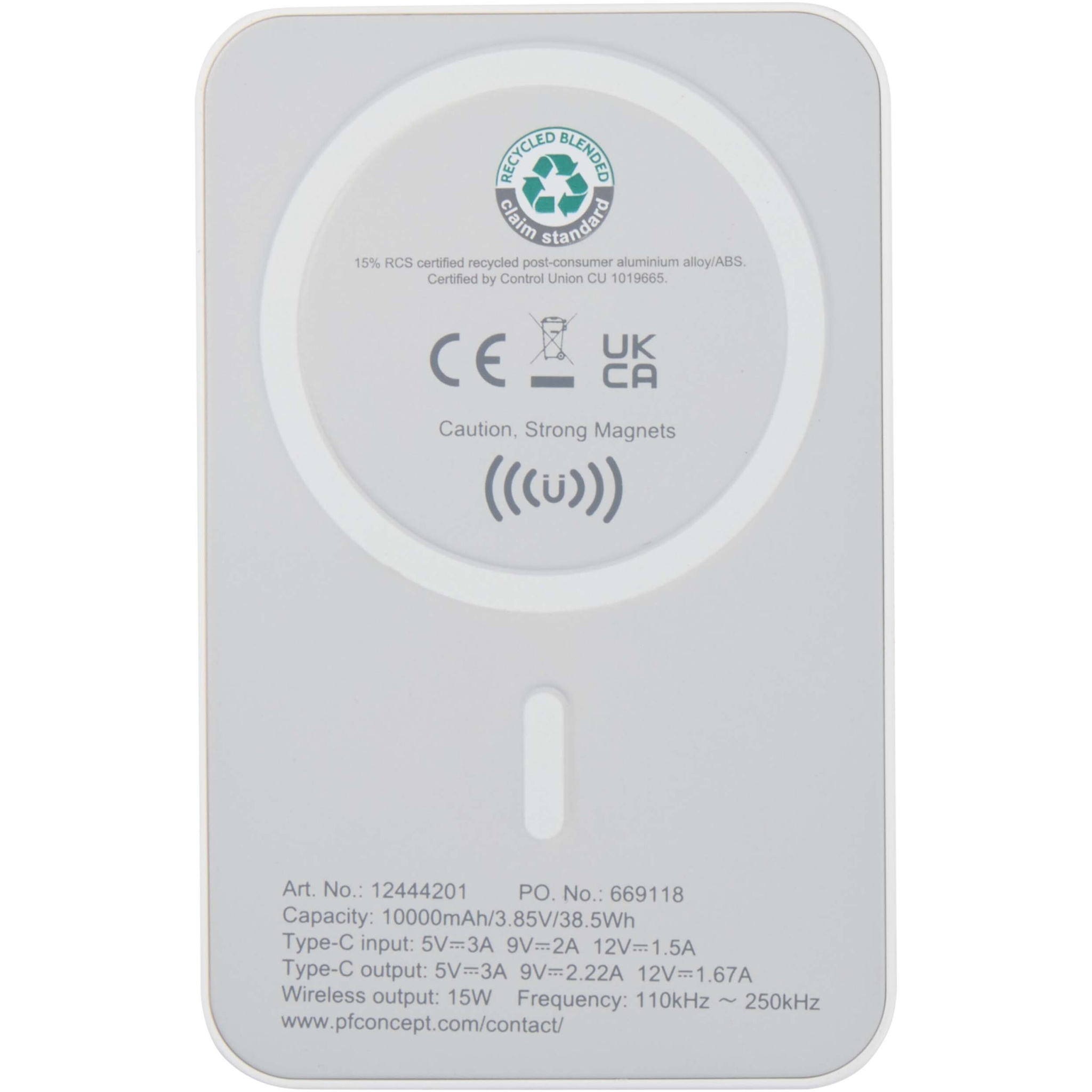 Laden Sie Ihre Geräte intelligenter und schneller mit der kompakten Acrab 10.000 mAh Powerbank aus recyceltem Kunststoff. Genießen Sie bis zu 15 W magnetisches kabelloses Laden für kompatible Smartphones, einschließlich iPhone 12 und neuerer Modelle. Für andere Geräte mit kabelloser Ladefunktion, jedoch ohne Magnetfunktion, liegt ein Metallringaufkleber für die sichere Ausrichtung bei. Die Powerbank unterstützt außerdem das 20-W-Schnellladen über Kabel (Typ C) sowie das gleichzeitige Laden von zwei Geräten (kabellos und über Kabel). So sind Sie auch unterwegs immer ausreichend mit Strom versorgt. Eine LED-Anzeige informiert über den Lade- und Batteriestatus.