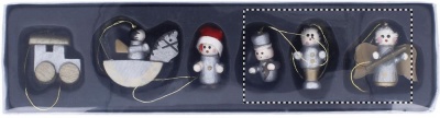 Set mit 6 Weihnachtsbaumanhängern aus Holz. Verschiedene Motive. Verpackt in einer Geschenkschachtel mit transparentem Deckel.