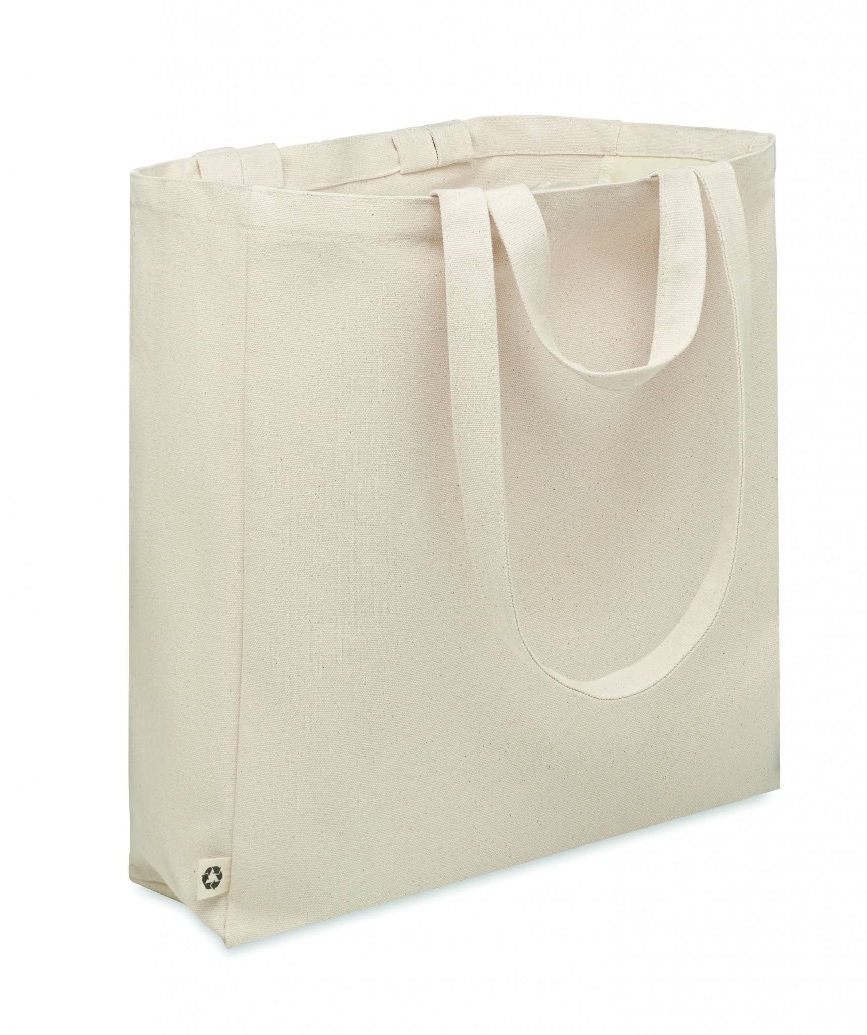 Einkaufs- oder Strandtasche aus recyceltem Polycotton (70 % recycelte Baumwolle, 30 % recycelter Polyester) mit kurzen Tragegriffen. Innentasche mit Reißverschluss. 380 g/m².