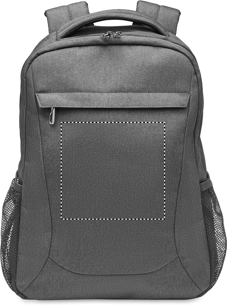 15'' Laptop-Rucksack aus 600D RPET Polyester. Internes Laptopfach und mehrere kleine Innenfächer. Fronttasche mit Reißverschluss und 2 seitliche Netztaschen. Verstellbare Schultergurte. Trolley-Halterung.