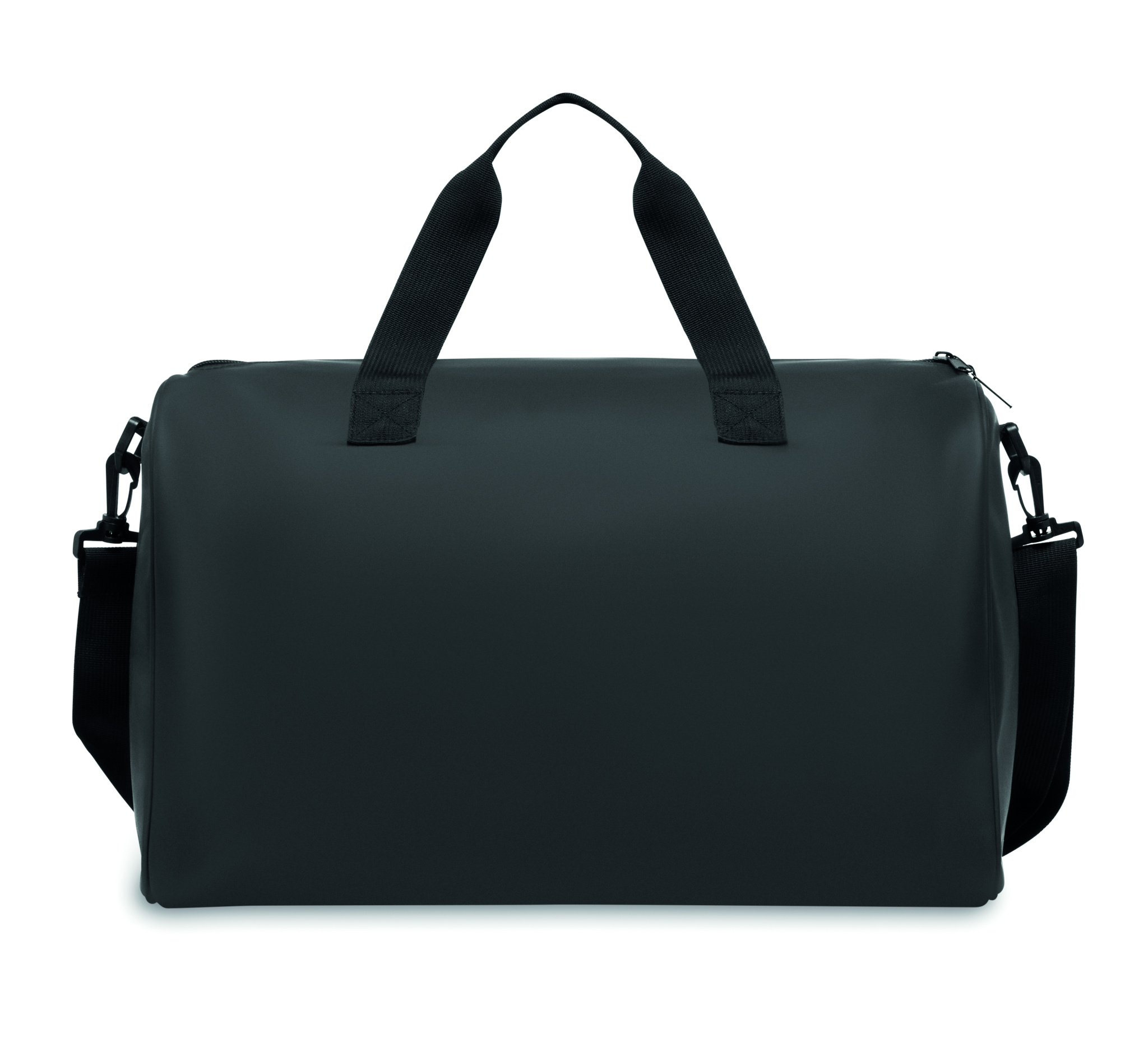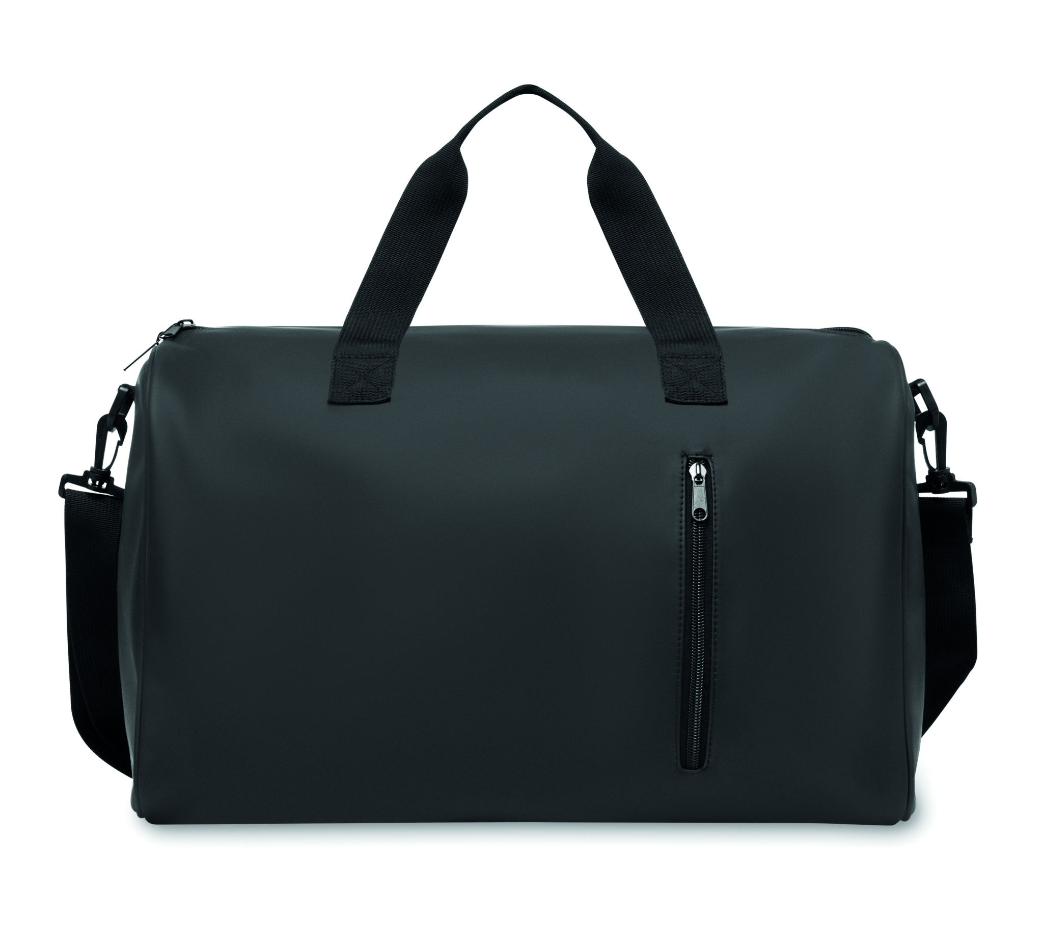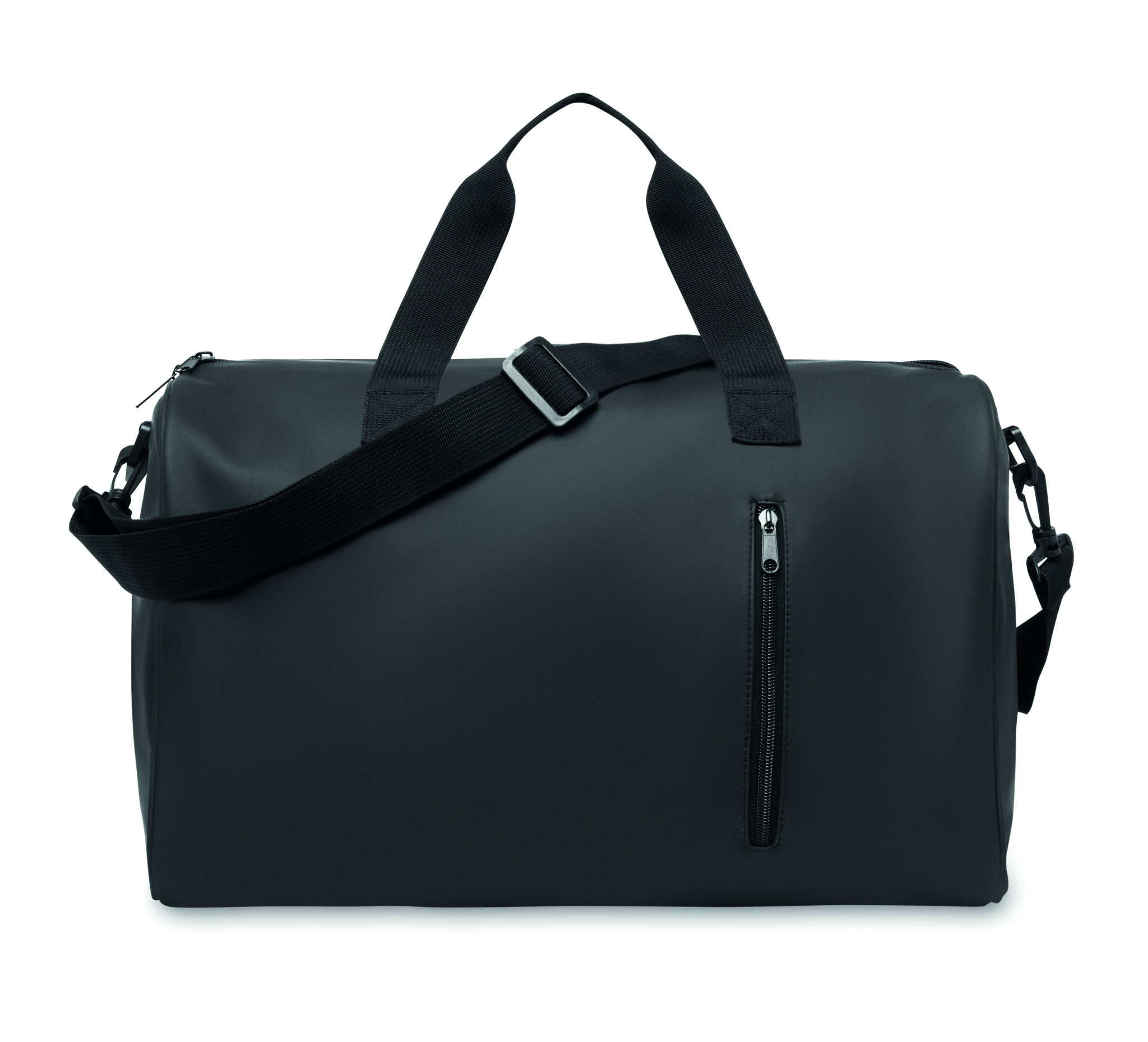 Sport- oder Reisetasche aus weichem PU mit schaumstoffverstärktem Boden. Hauptfach und Fronttasche mit Reißverschluss. Futter aus 210D RPET-Polyester. 2 Griffe und verstellbarer, abnehmbarer Schultergurt.