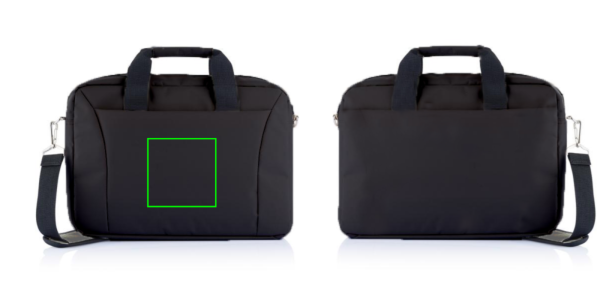 300D polyester laptop bag which is ideal for lightweight travelling. It has all the pockets you need, 15.4” laptop compartment, space to put your papers and a trolley sliding system. PVC free.