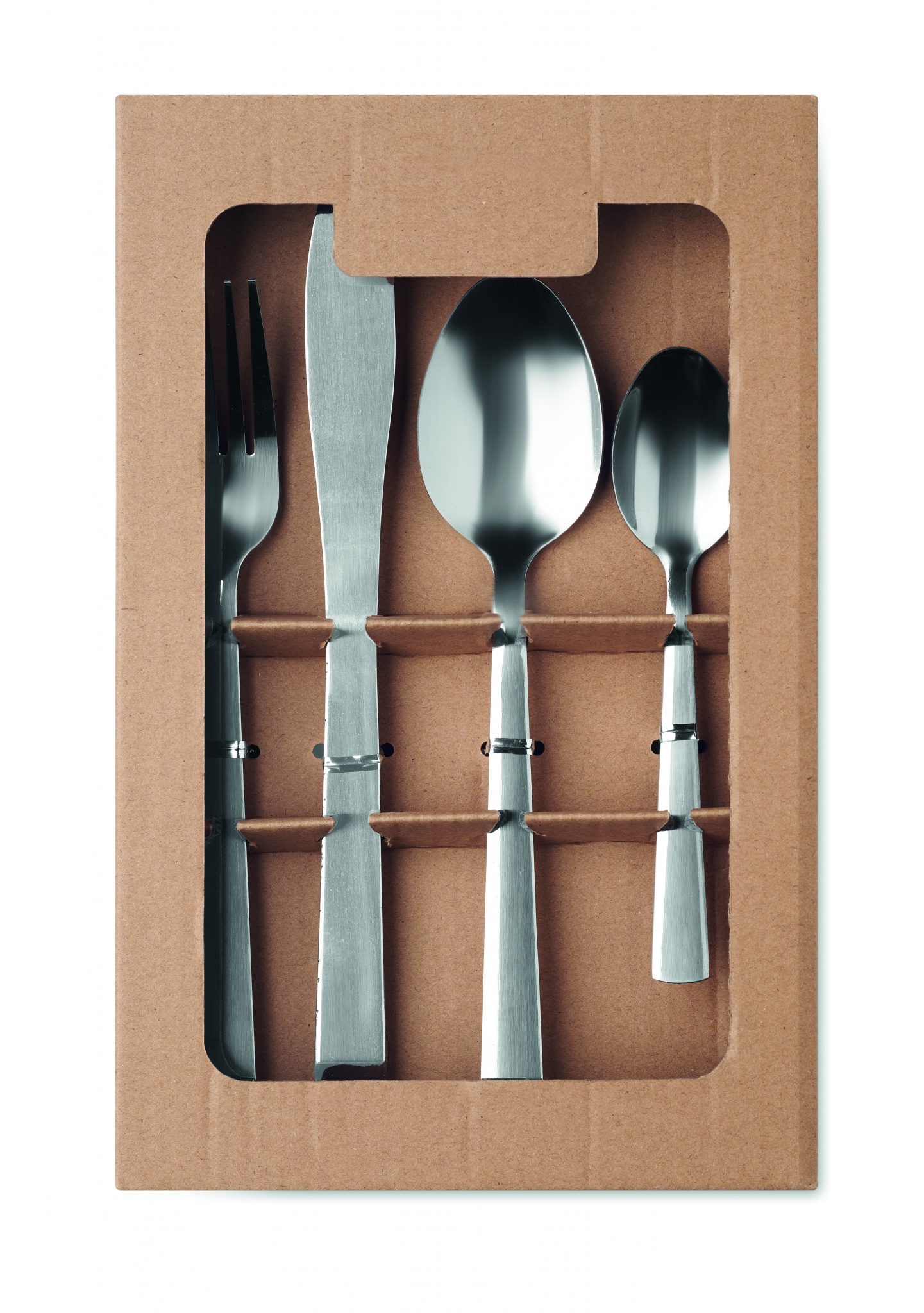 16 piece stainless steel cutlery set for 4 place settings. Including: tea spoon, table spoon, fork, knife. Presented in a kraft paper box.