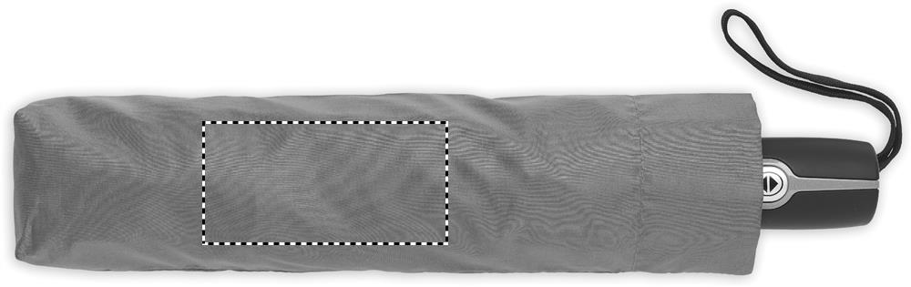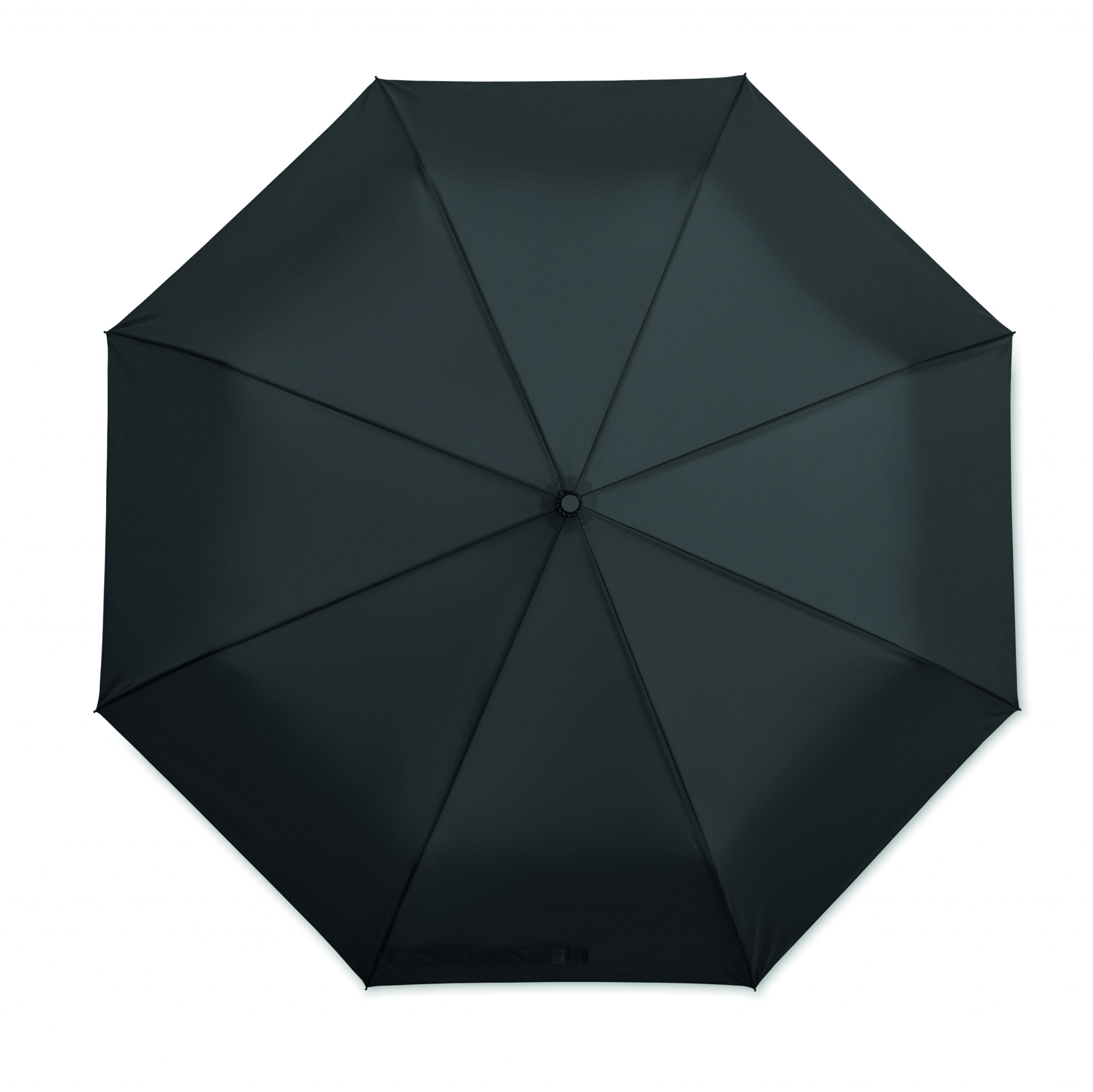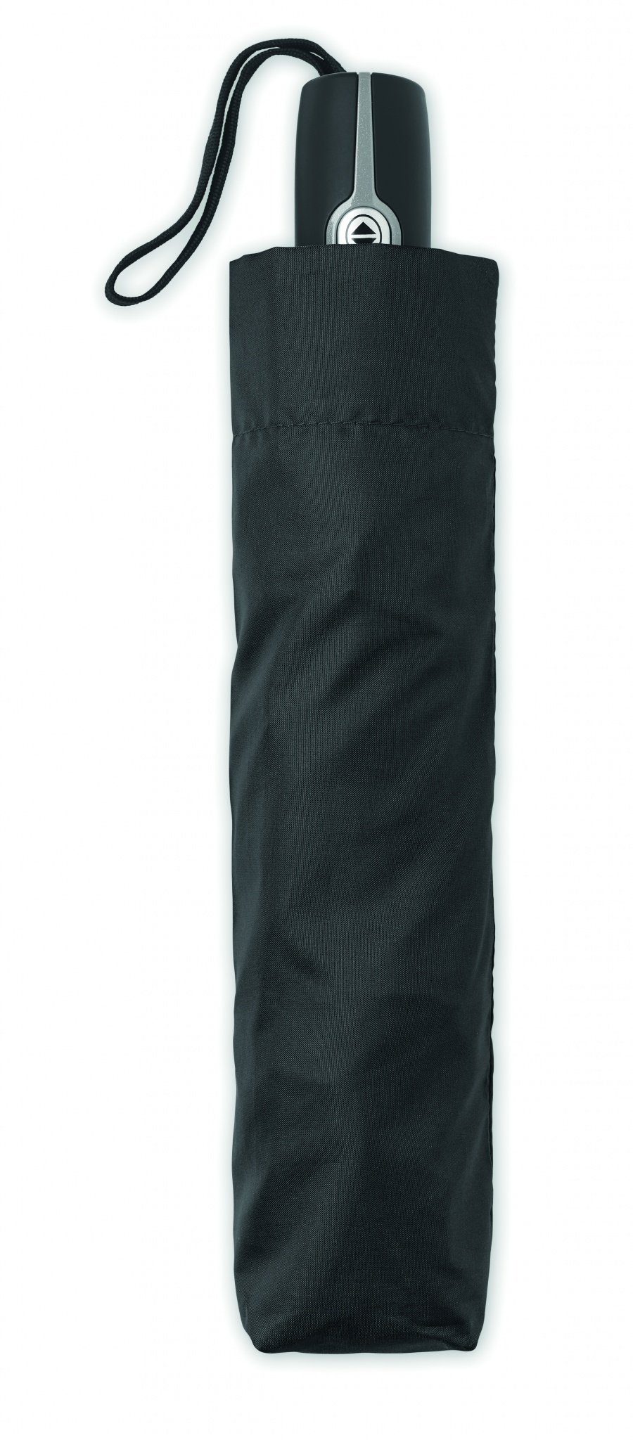 27 inch 3 fold auto open/close windproof umbrella. 190T pongee material black plated steel shaft. Fibreglass ribs, 1 part black plating inside frame. Black PP handle with button. With matching pouch.