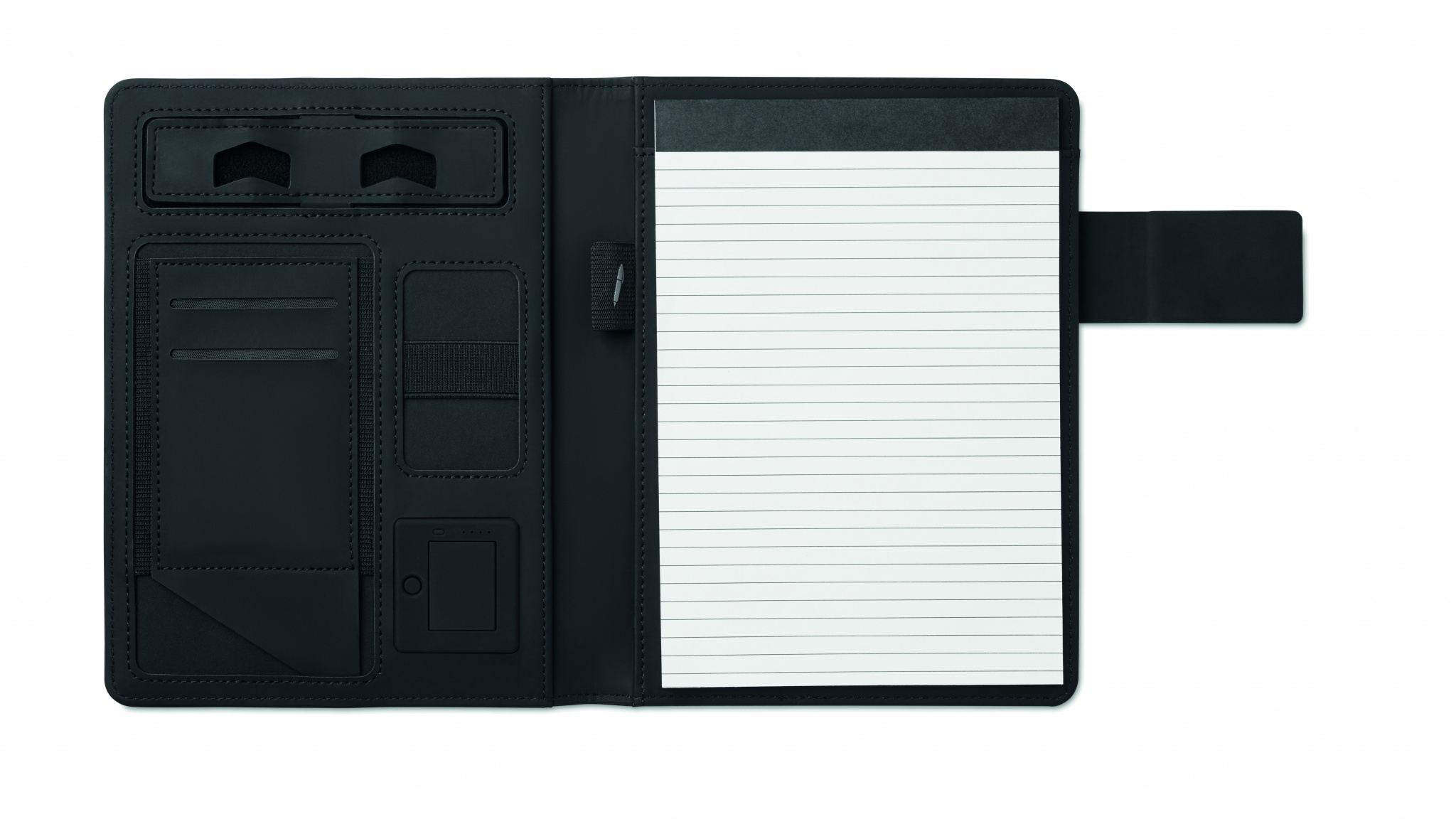 A5 conference folder with linen-PU cover. 4000 mAh power bank. Built-in micro USB to a Type C connector. 20 lined sheets notepad. Multiple internal compartments. Magnetic closure. Elastic pen holder.