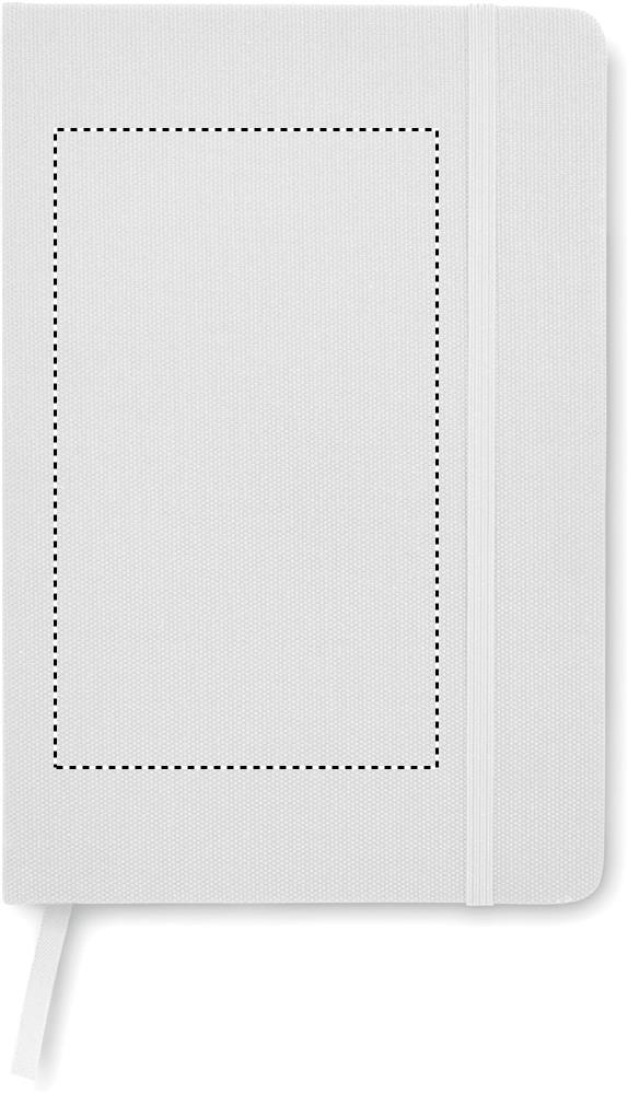 A5 notebook with hard 600D RPET cover. Casebound. 160 lined recycled paper pages (80 sheets). Matching elastic closure strap and ribbon bookmark.