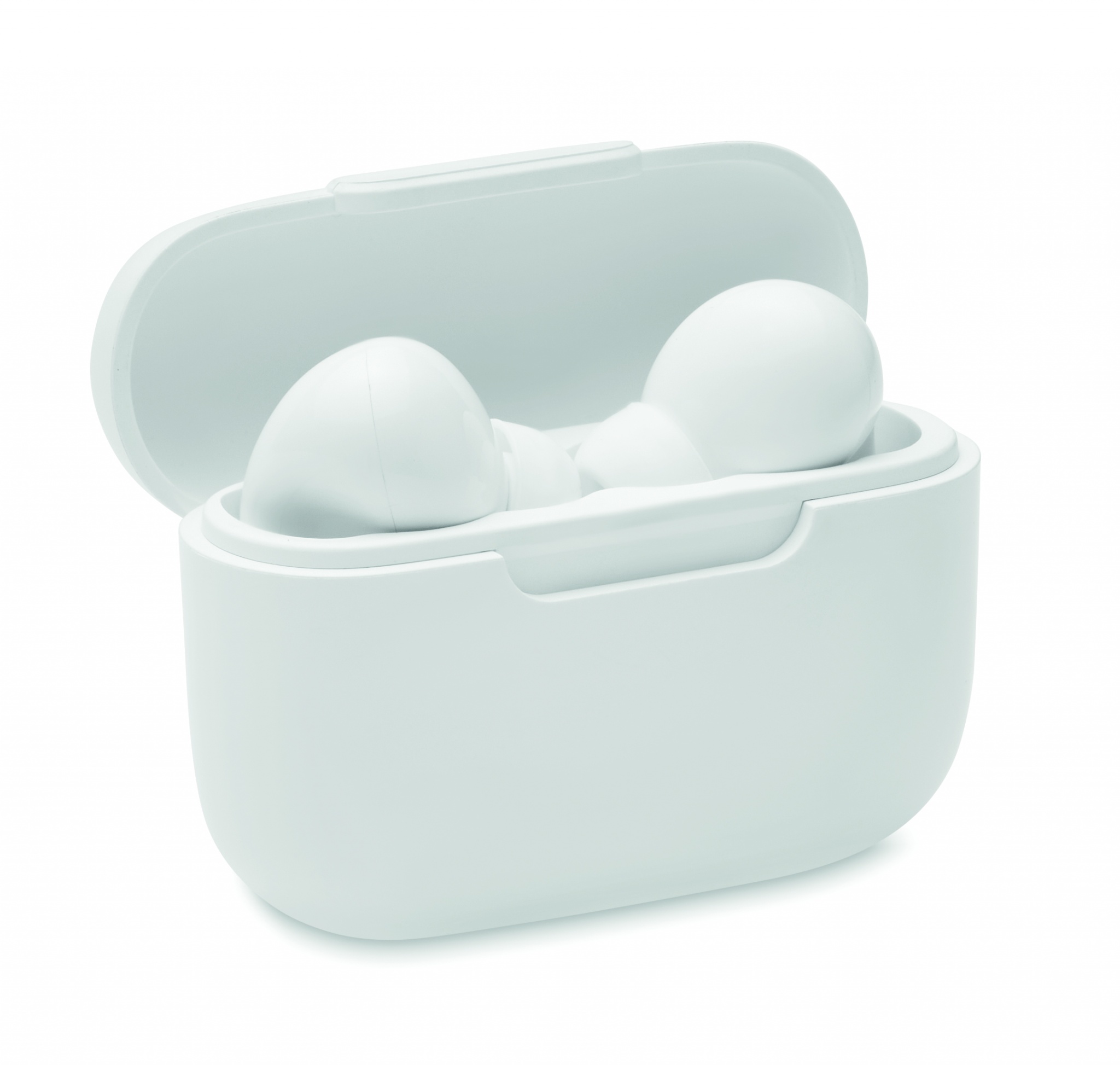 ABS True Wireless Stereo (TWS) 5.3 wireless stereo earbuds with microphone and 30 mAh battery. Playing time approx. 3 hours. Type-C input. Auto-pairing. Including a Type C charging cable and a 180 mAh charging station.