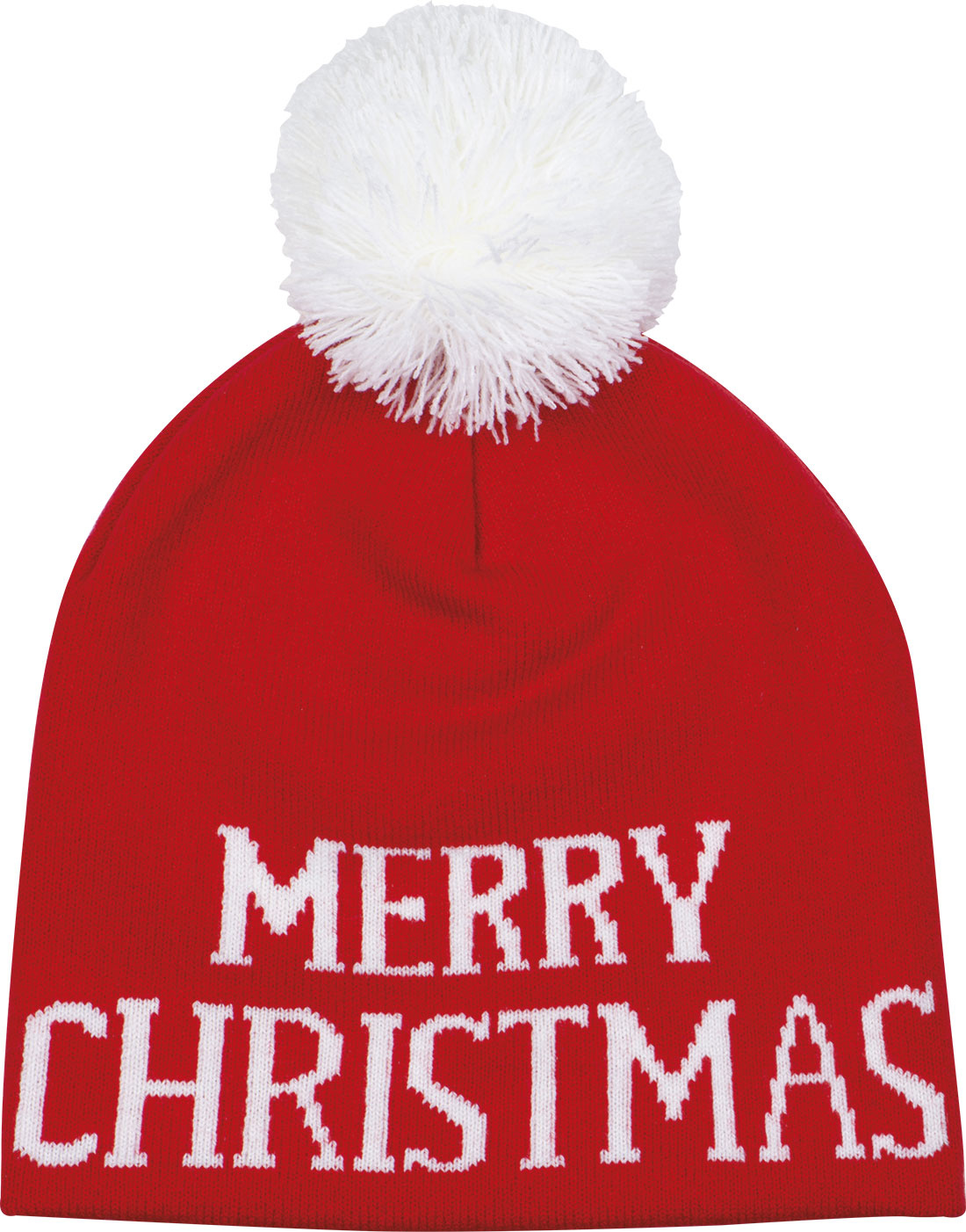 Christmas knit hat made from acrylic with 2% Spandex for a perfect fit. It features a pompom and `Merry Christmas` inscription, completing its festive look. Cozy and festive for the holidays.
