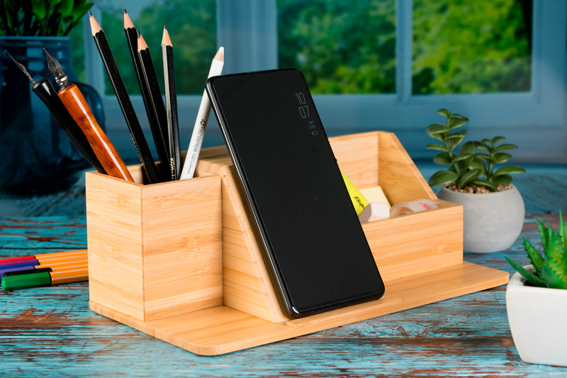 Bamboo desk organizer with 10 watt induction charging station, storage compartment, pen holder and charging cable (notepad is not included). Your logo will be engraved on the organizer. The natural bamboo grain makes each item and engraving unique.