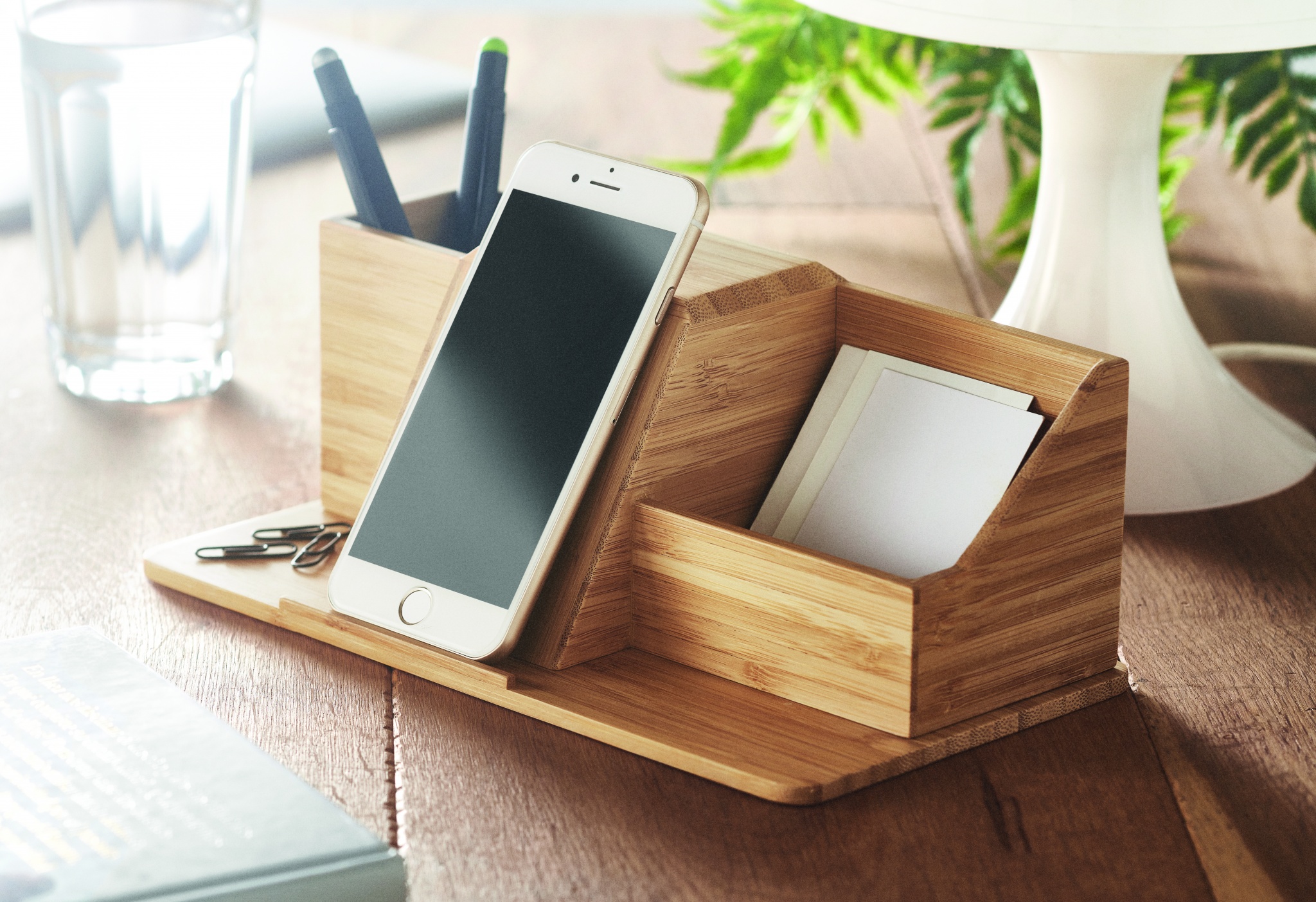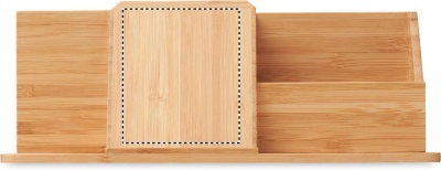 Bamboo desk organizer and pen holder with 10W wireless charging phone stand. Output: DC 9V/1.1A (10W) for quick charging. Compatible with latest Androids, iPhone® 8 and newer. Bamboo is a natural product, there may be slight variations in colour and size per item, which can affect the final decoration outcome.