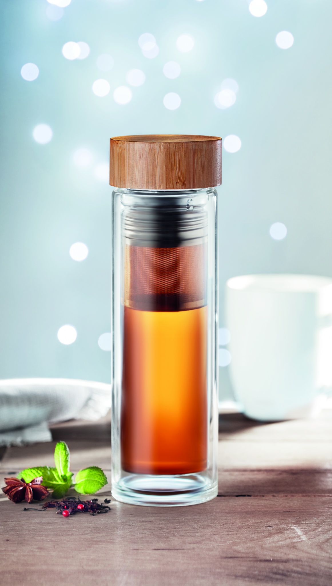 Double wall in high borosilicate glass bottle and bamboo lid with tea infuser. Capacity: 400 ml. Bamboo is a natural product, there may be slight variations in colour and size per item, which can affect the final decoration outcome. Leak free. Laser engraving is not possible on borosilicate glass.