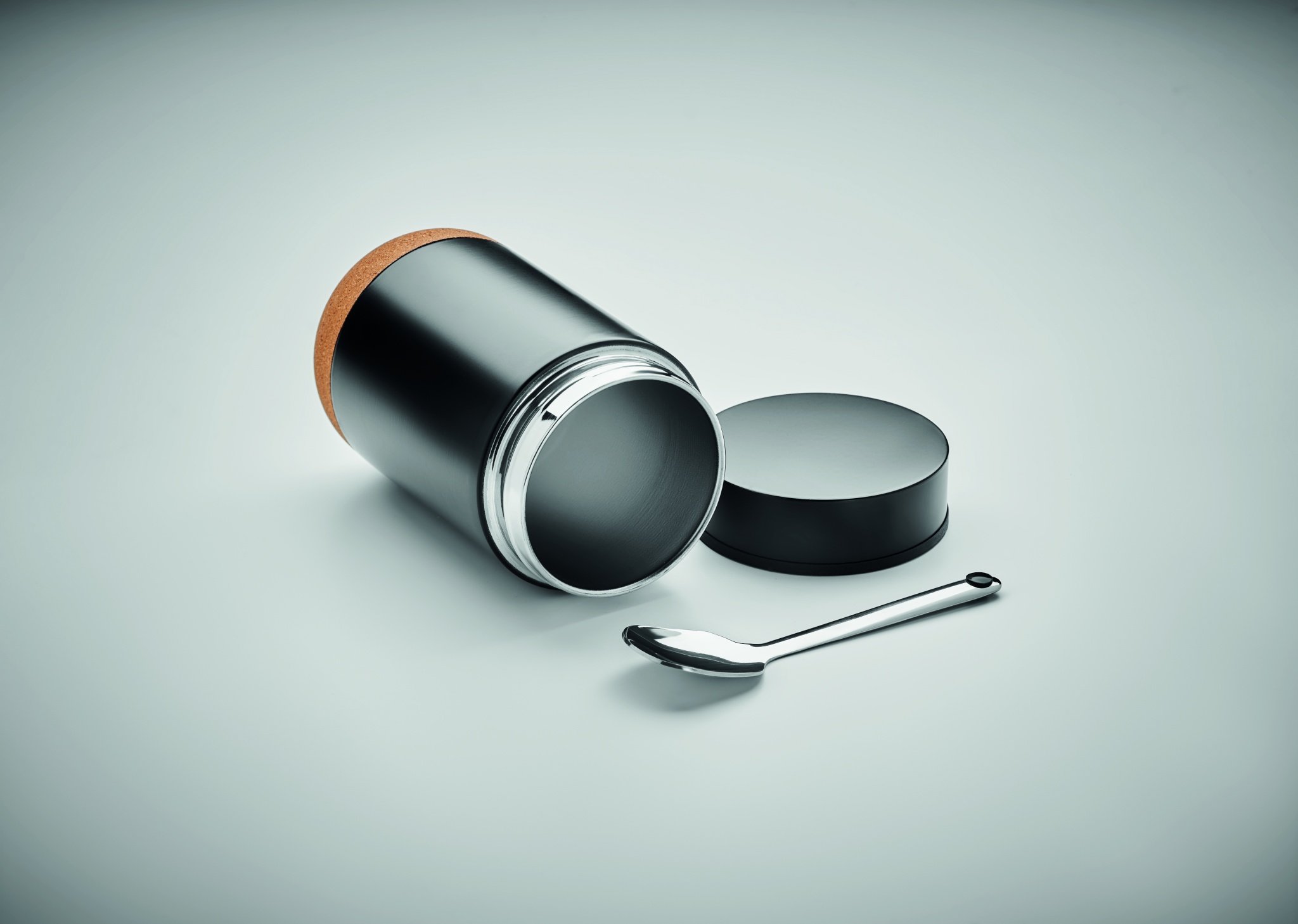 Double wall stainless steel insulated storage jar with a screw top and cork base detail. Includes spoon. Capacity: 400ml. Cork is 100% natural material. Due to its structural nature and surface porosity the final print result per item may have deviations.