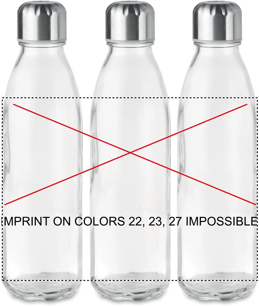 Glass drinking bottle with stainless steel lid. Capacity: 650 ml. Not suitable for carbonated drinks. Leak free.