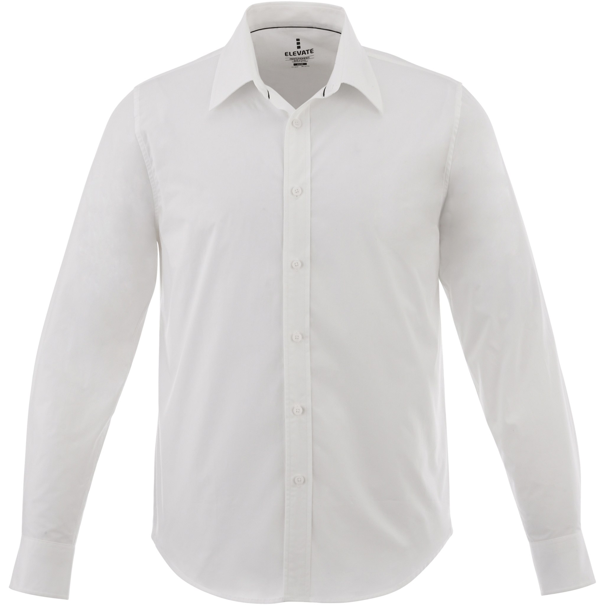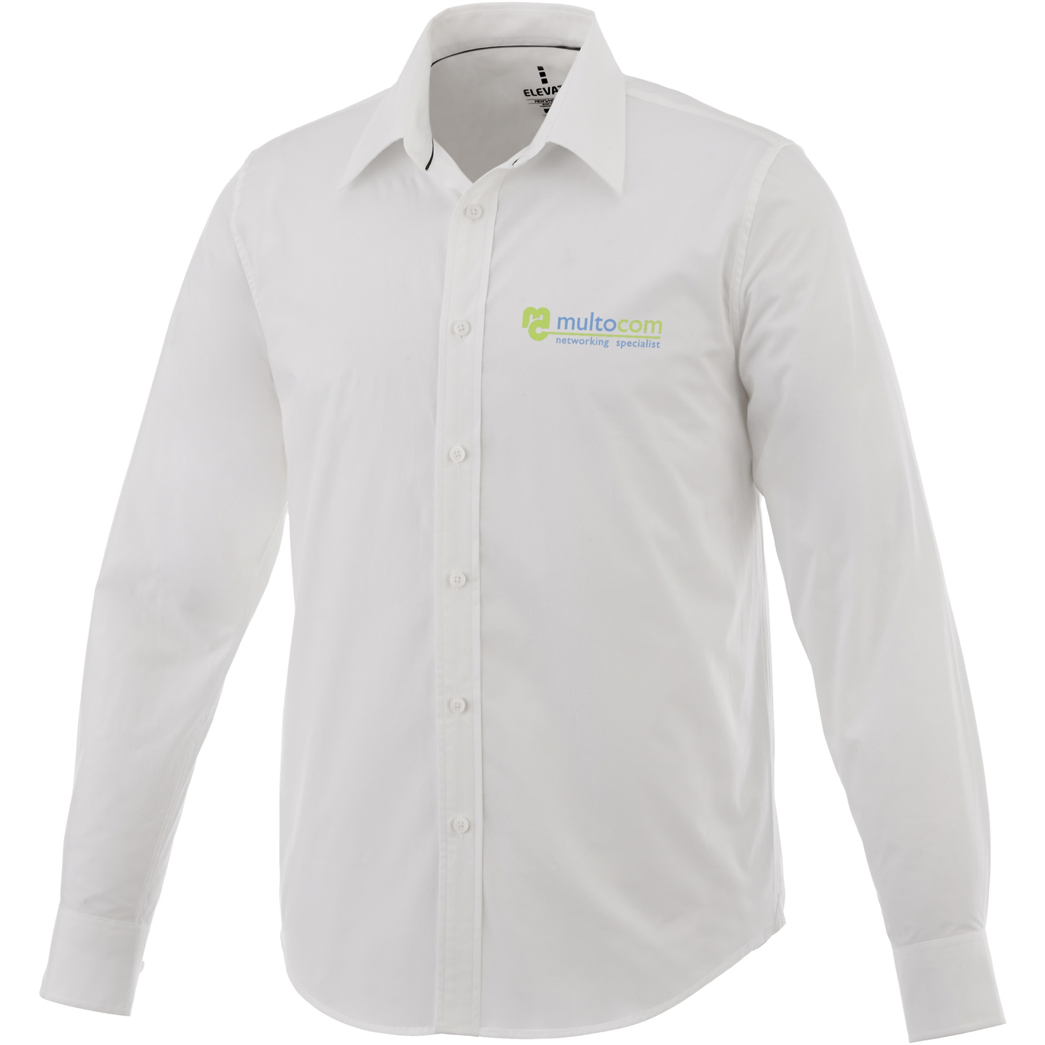 The Hamell long sleeve men's stretch shirt – an ideal combination of style and comfort. This woven shirt features a lightweight poplin fabric of 97% cotton and 3% elastane. Poplin fabric is known for its tight weave, which provides exceptional durability while maintaining a soft and smooth texture against the skin. This means that the Hamell shirt is not only comfortable to wear but also resistant to everyday wear and tear, ensuring long-lasting use. The added stretch provides ultimate freedom of movement, ensuring optimal comfort throughout the day even more. Its hidden button-down collar adds sophistication while maintaining a clean look.