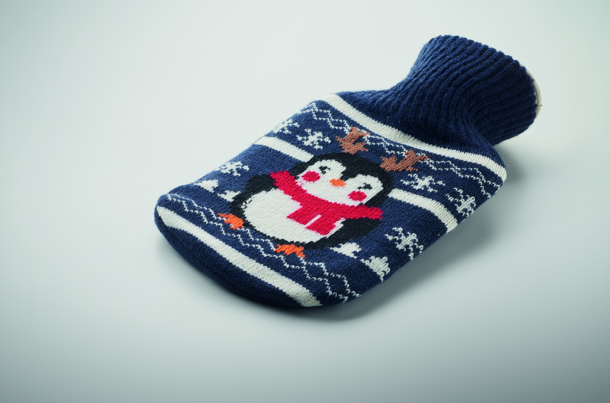 Hot water bottle with jersey in Christmas pattern. Used to provide warmth, typically whilst in bed, but also for the application of heat to a specific part of the body. 250 ml capacity.