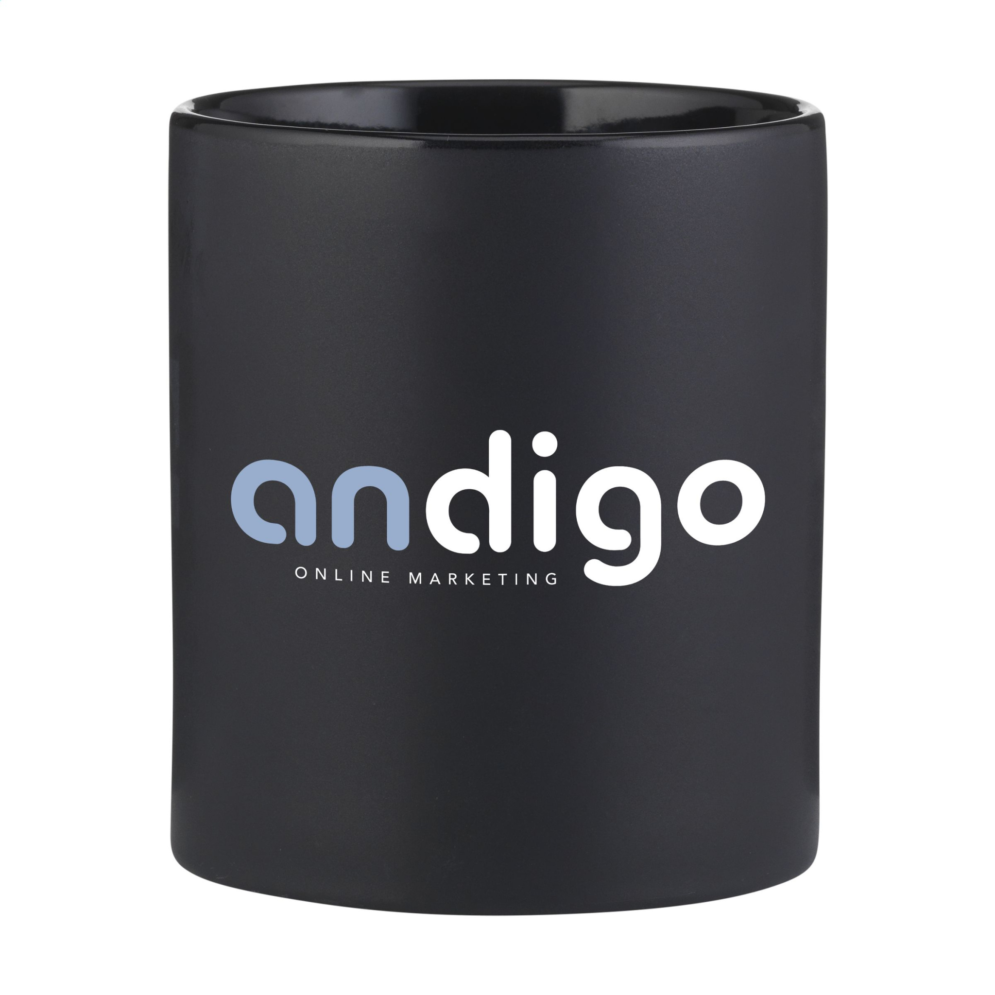 High quality ceramic mug with a matt black exterior and a glossy black interior. Dishwasher safe. The imprint is dishwasher tested and certified: EN 12875-2. Capacity 350 ml.