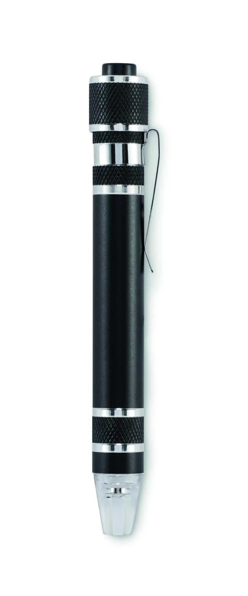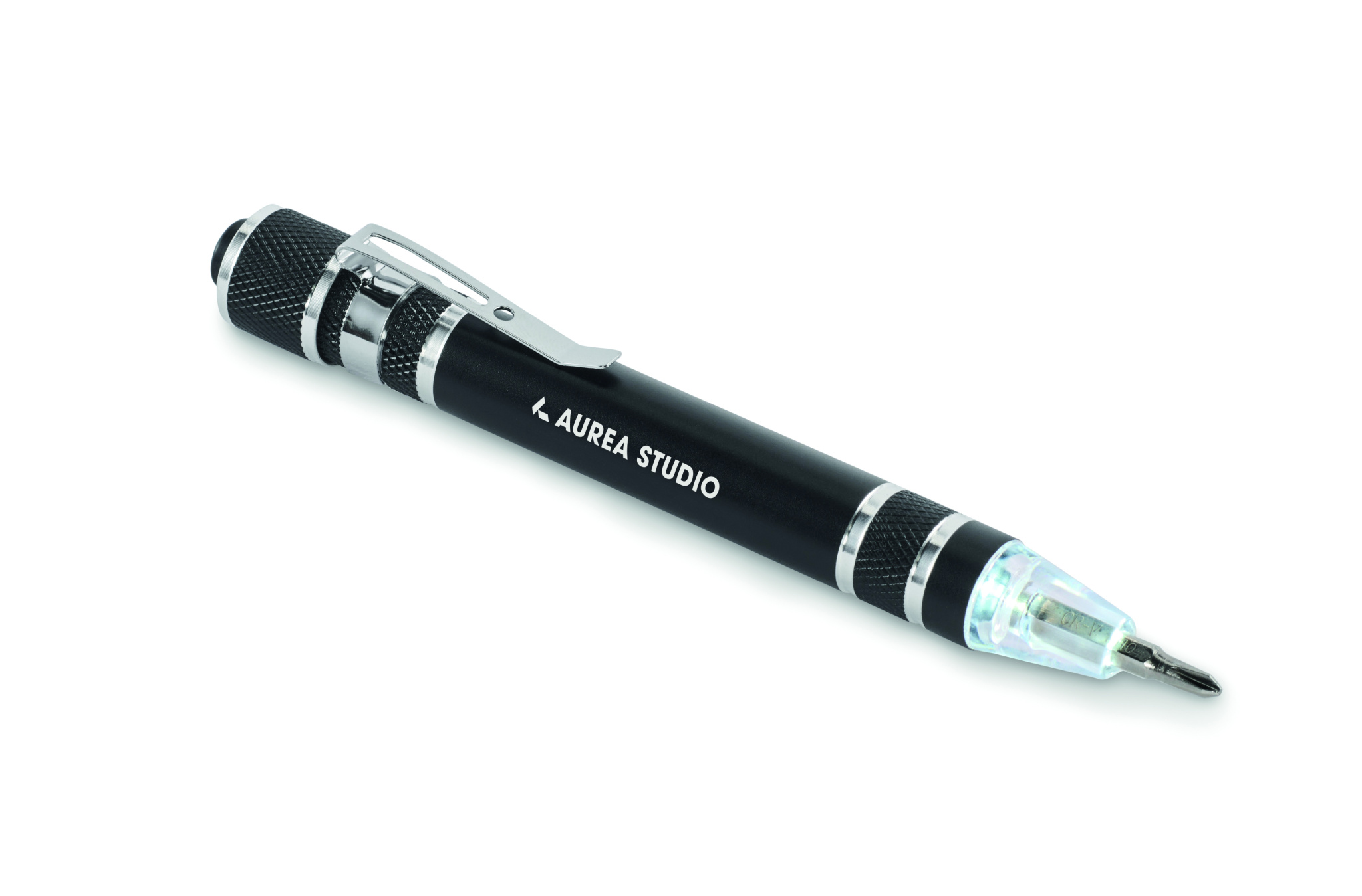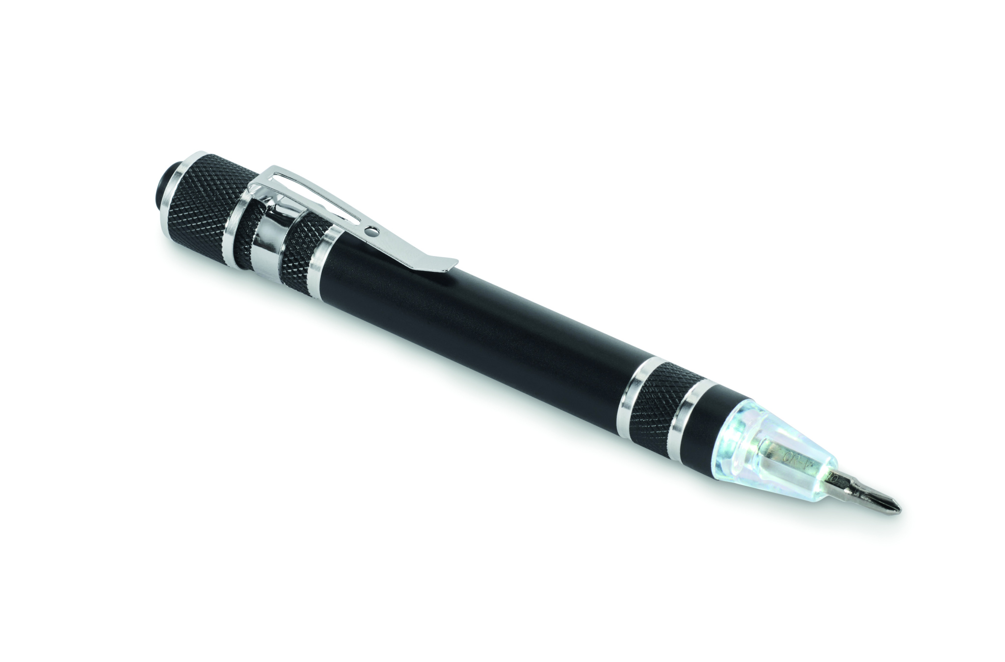 Recycled aluminium multi tool in pen shape with torch. Includes 3 slotted and 3 Phillips screwdriver heads. 4 button cell LR41 batteries included.