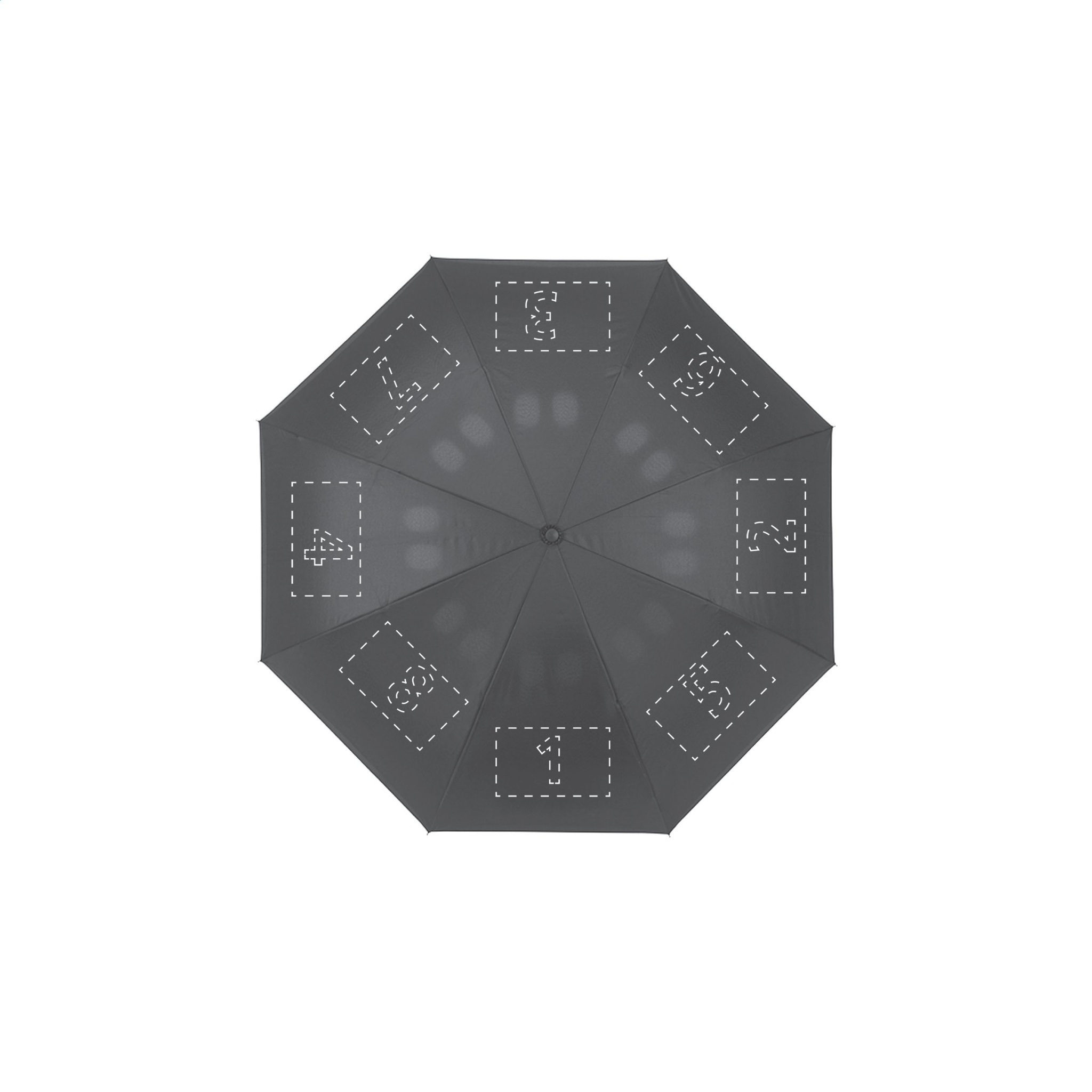 Large, innovative reverse umbrella with double 190T pongee slings. Special material that accelerates drying. Can dry standing up. Closes automatically, opens manually. Ideal when getting in and out of the car. Metal frame with windproof system and ergonomically shaped handle with carrying strap.