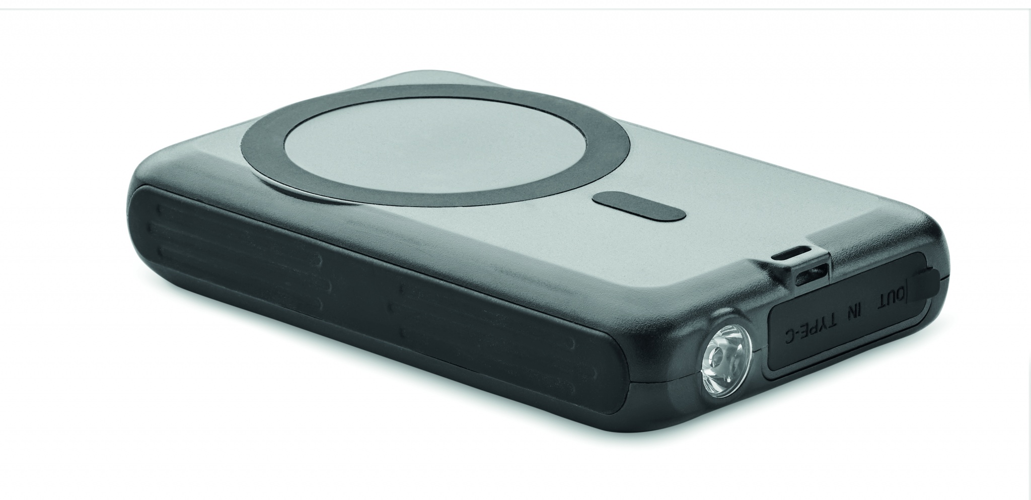 Magnetic wireless charger (5W) Power bank 5000 mAh in ABS and solar panel. Output: DC 5V/2A. Compatible with iPhone® 12 and newer. Including additional magnetic metal ring to support charging of non-magnetic wireless chargeable phones.
