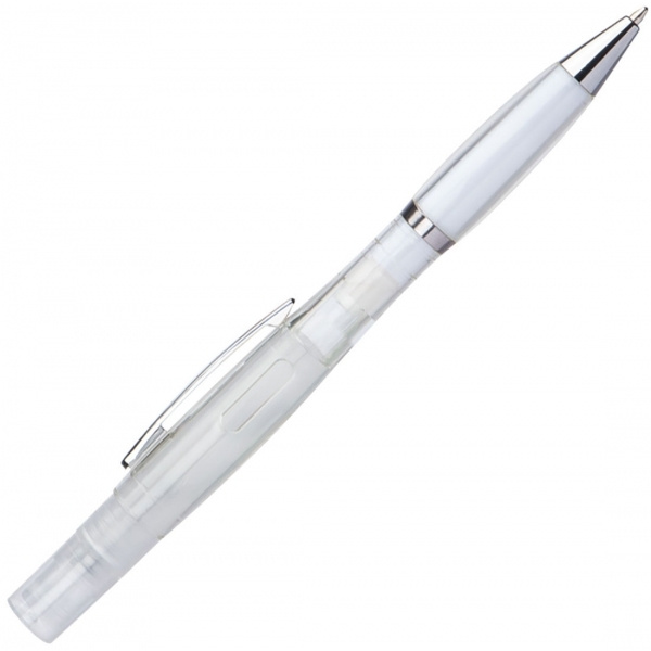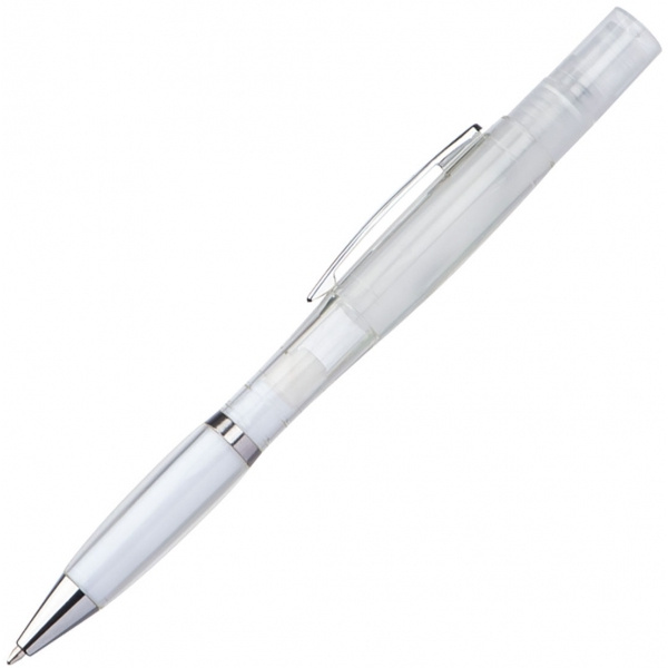 Translucent Twistpen with silver applications and blue-writing refill. The sprayer is refillable - perfect for perfume or desinfection fluids.We print your logo on the right side of the clip.