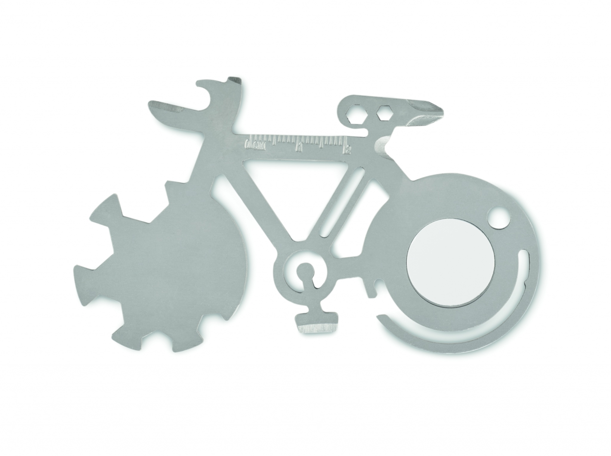 Multi-tool 11-in-1 stainless steel bicycle shaped. From bottle opener, knife, ruler or Phillips screwdriver tools.