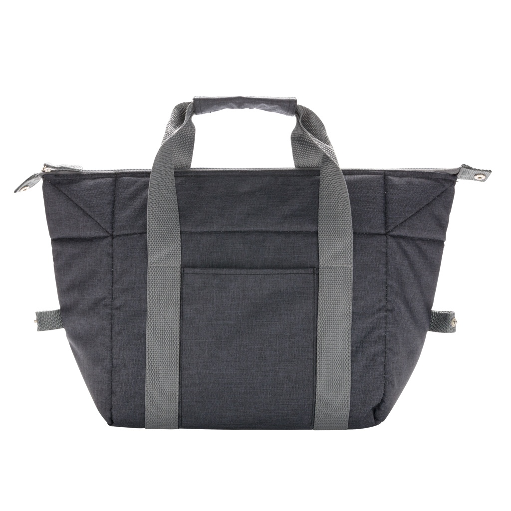 Medium size 600D tote cooler bag. Can hold up to 26 cans. Can be easily transformed to a duffle bag by closing the side buttons. With front sleeve pocket.