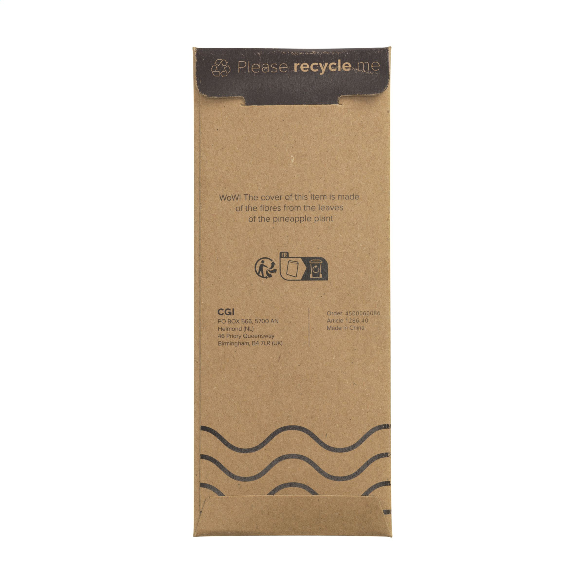 WoW! Keychain made from pineapple imitation leather. Attached to a sturdy, metal key ring. The vegan imitation leather is virtually indistinguishable from real leather. However, the material is made from pineapple leaves, a residual product from pineapple cultivation. For this reason, no additional substances are needed, such as water, fertilizer or pesticides for its production. The fibers of the pineapple leaves are washed, enriched with PU and dried in the oven. The result? Supple sheets of vegan imitation leather, which are then provided with a beautiful finish. After drying, a soft and attractive material with the properties of leather is created. It consists partly of fruit remains and partly of PU.