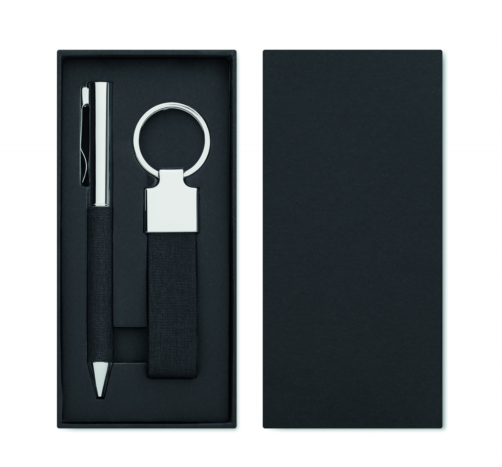 2-osaline kinkekomplekt kinkekarbis. Sisaldab metallist keermega pastapliiatsit RPET polüesterdetailide ja RPET polüester võtmehoidjaga. Sinine tint.