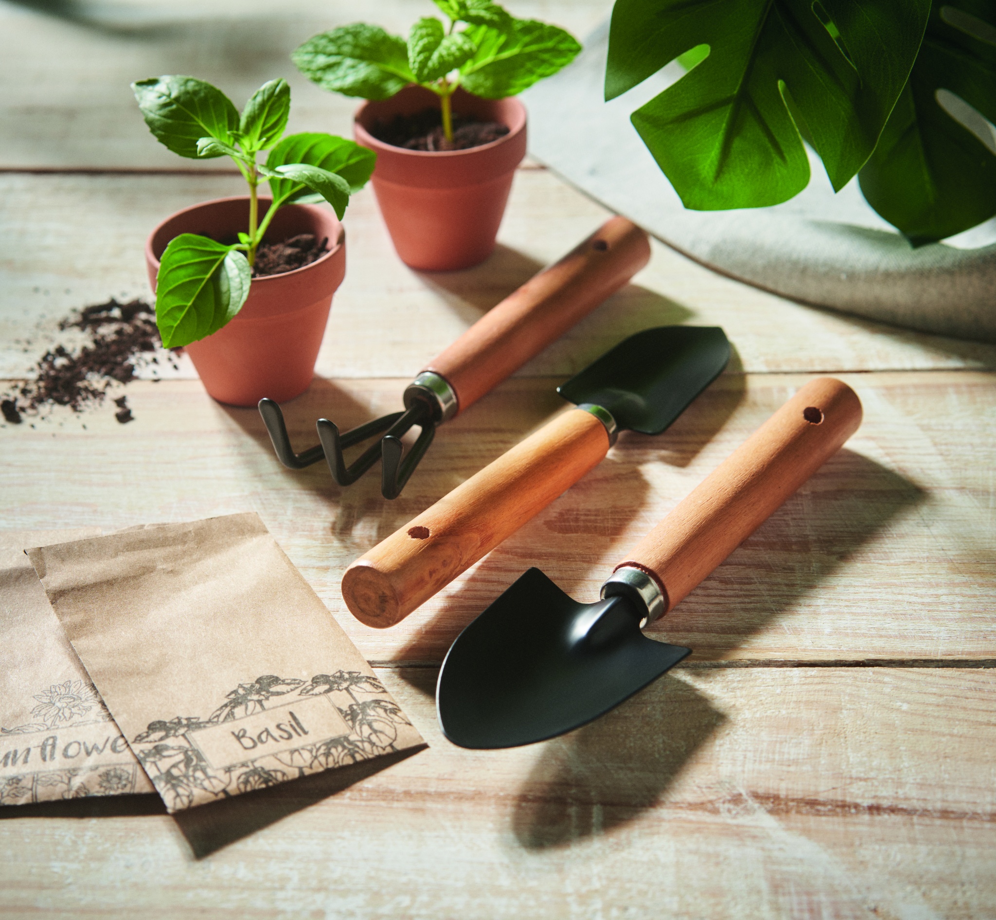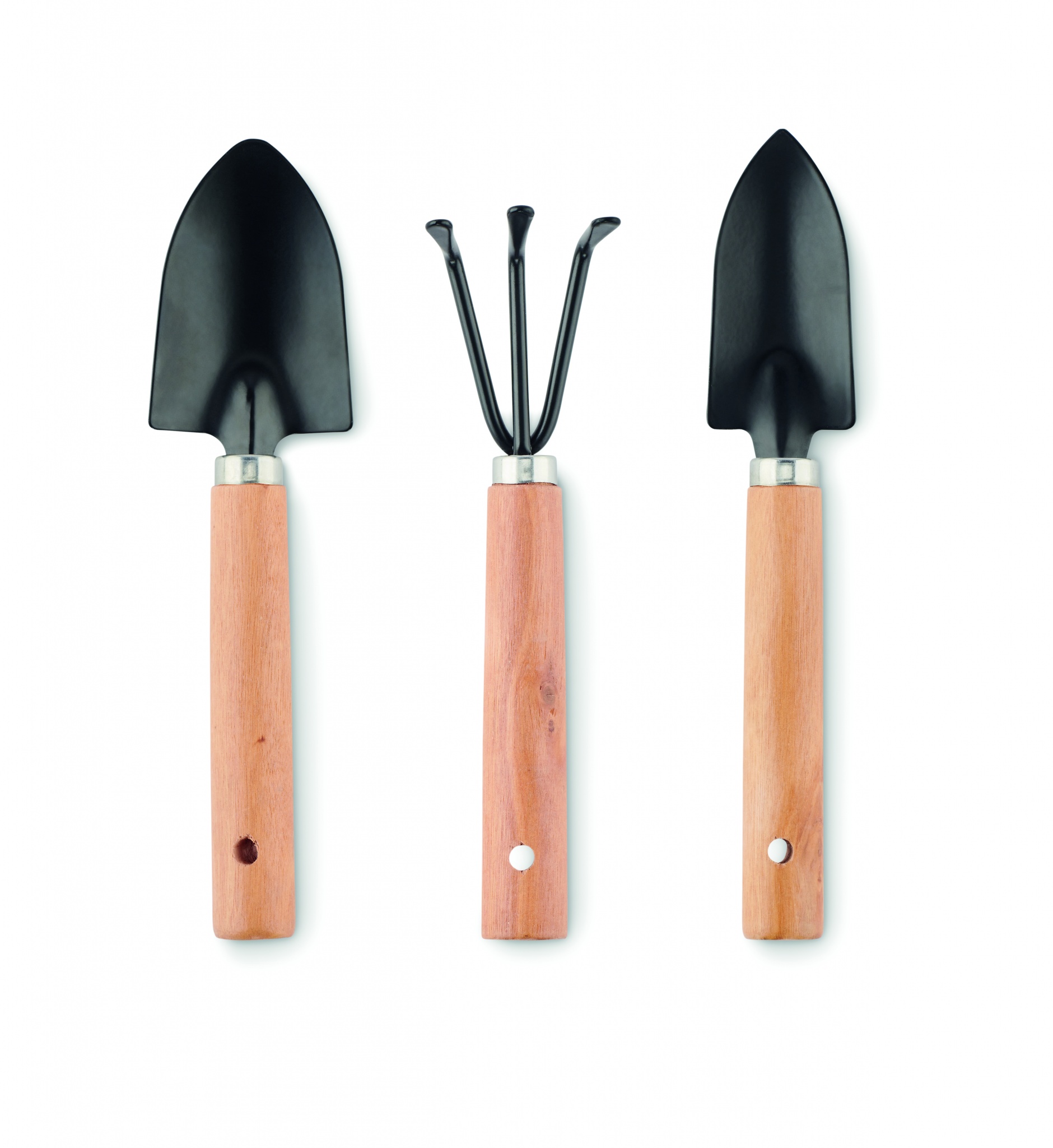 Komplektis 3 aiatööriista. Äke ja 2 labidat. Esitatakse RPET vildist kotis, millel on konks ja välimus.