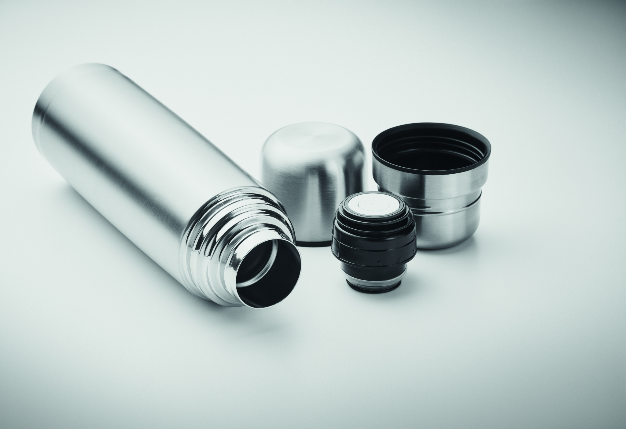 Kahekordse seinaga taaskasutatud roostevabast terasest (90% taaskasutatud roostevabast terasest ja 10% roostevabast terasest) isoleeritud vaakumtermos 2 integreeritud tassiga (sisesein PP) kaanega. Pudeli maht: 750 ml, välimine tass: 150 ml, sisemine tass: 125 ml.