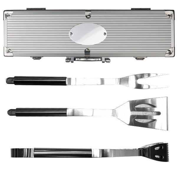 Grillkohver, mis koosneb grilltangidest, lihahargist ja grilli keerajast metallist korpuses. Laserime teie logo korpuse ovaalsele metallplaadile.