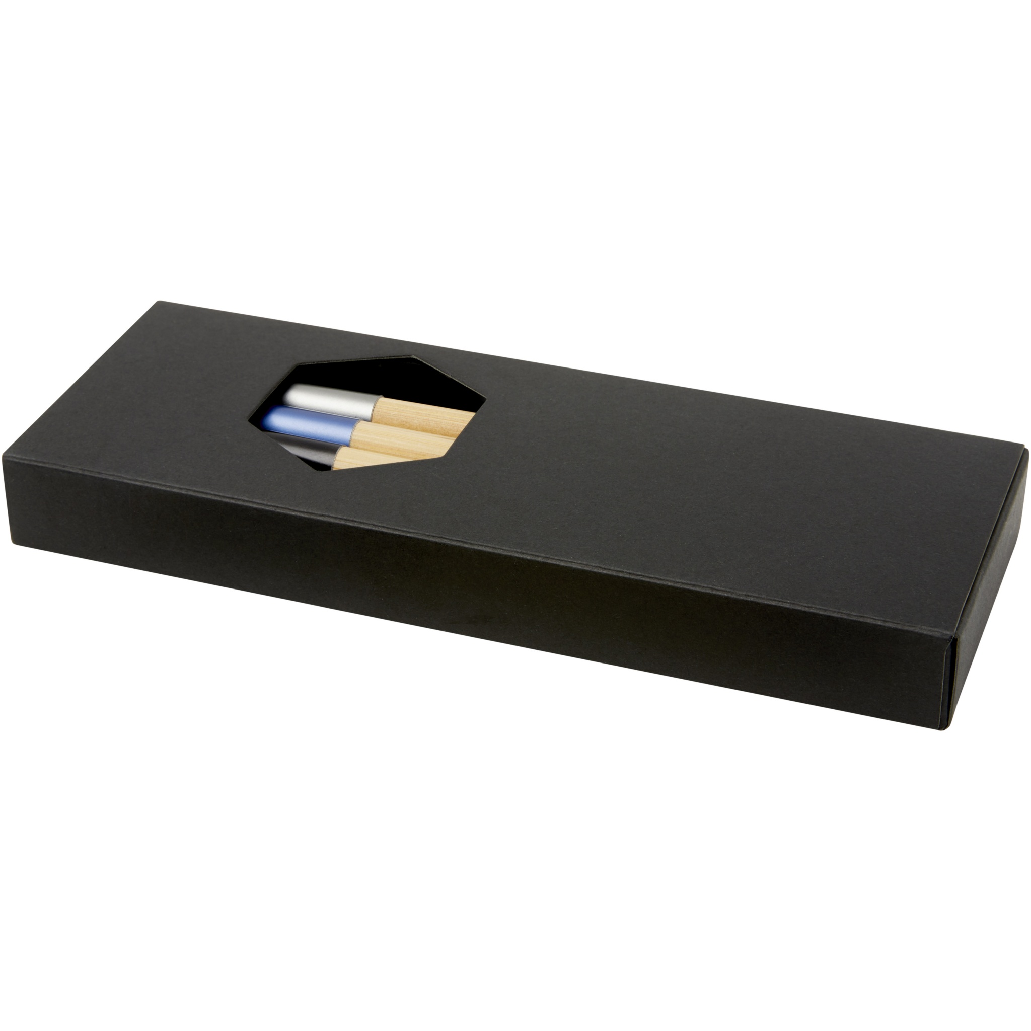 Eksklusiivse disainiga pastapliiatsi komplekt, mis koosneb kolmest värviaktsendiga pastapliiatsist. Sinise alumiiniumplaadiga pastapliiats on eellaaditud sinise täidisega, ülejäänud kaks pliiatsit on eellaaditud musta täidisega. Pakitud musta kinkekarpi.