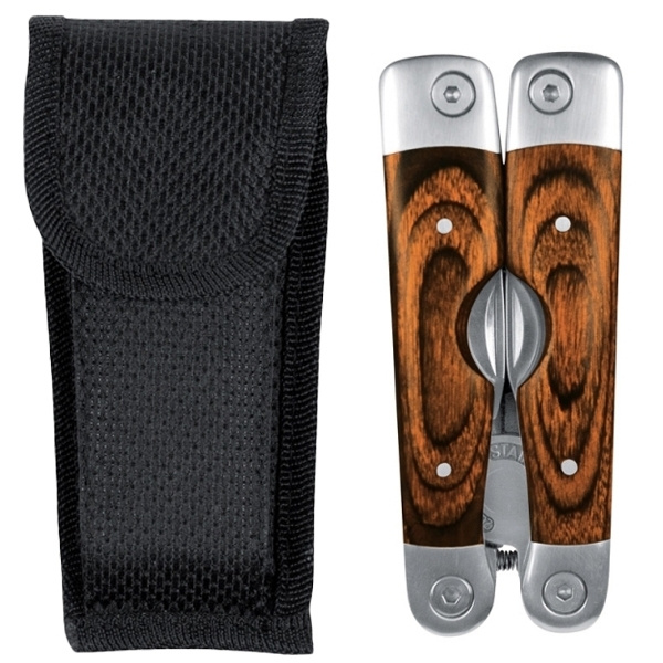 Roostevabast terasest multifunktsionaalne tööriist, šikkide puidust kestadega käepidemetel: suured lõikefunktsiooniga tangid, väike saag mõõtesõlme ja viiliga, nuga, Phillipsi kruvikeeraja, kolm erineva laiusega kruvikeerajat, väike nuga kaabliisolatsiooni eemaldajaga ja konserviavaja. Multitööriist on rihmakotis, nii et saate seda alati endaga kaasas kanda. Graveerime käepidemele teie logo.