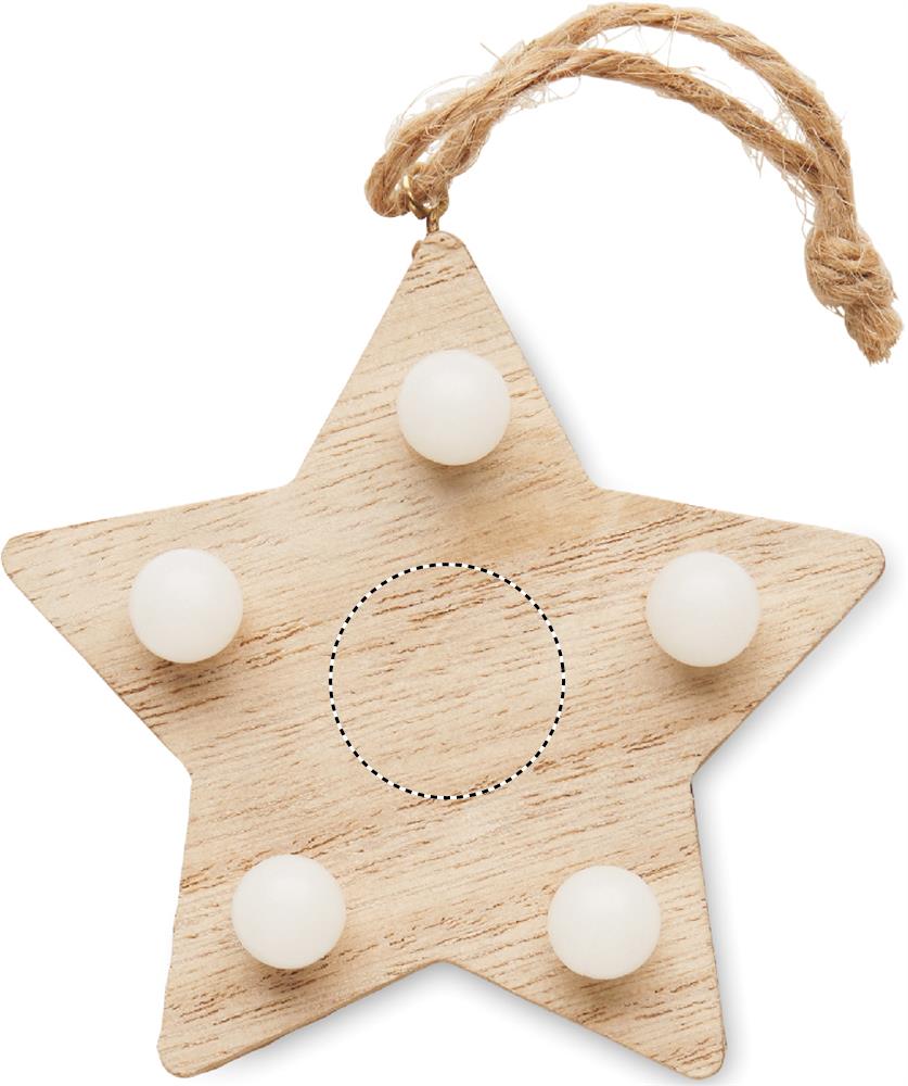 Puit (80% papli puit ja 20% umbrohi puit) kaunistatud täht 5 LED valgusti ja riputusnööriga. Kaasas 1 CR2032 patarei. Puit on looduslik toode, ühe eseme värvis ja suuruses võib esineda väikesi erinevusi, mis võivad mõjutada lõppviimistlust.