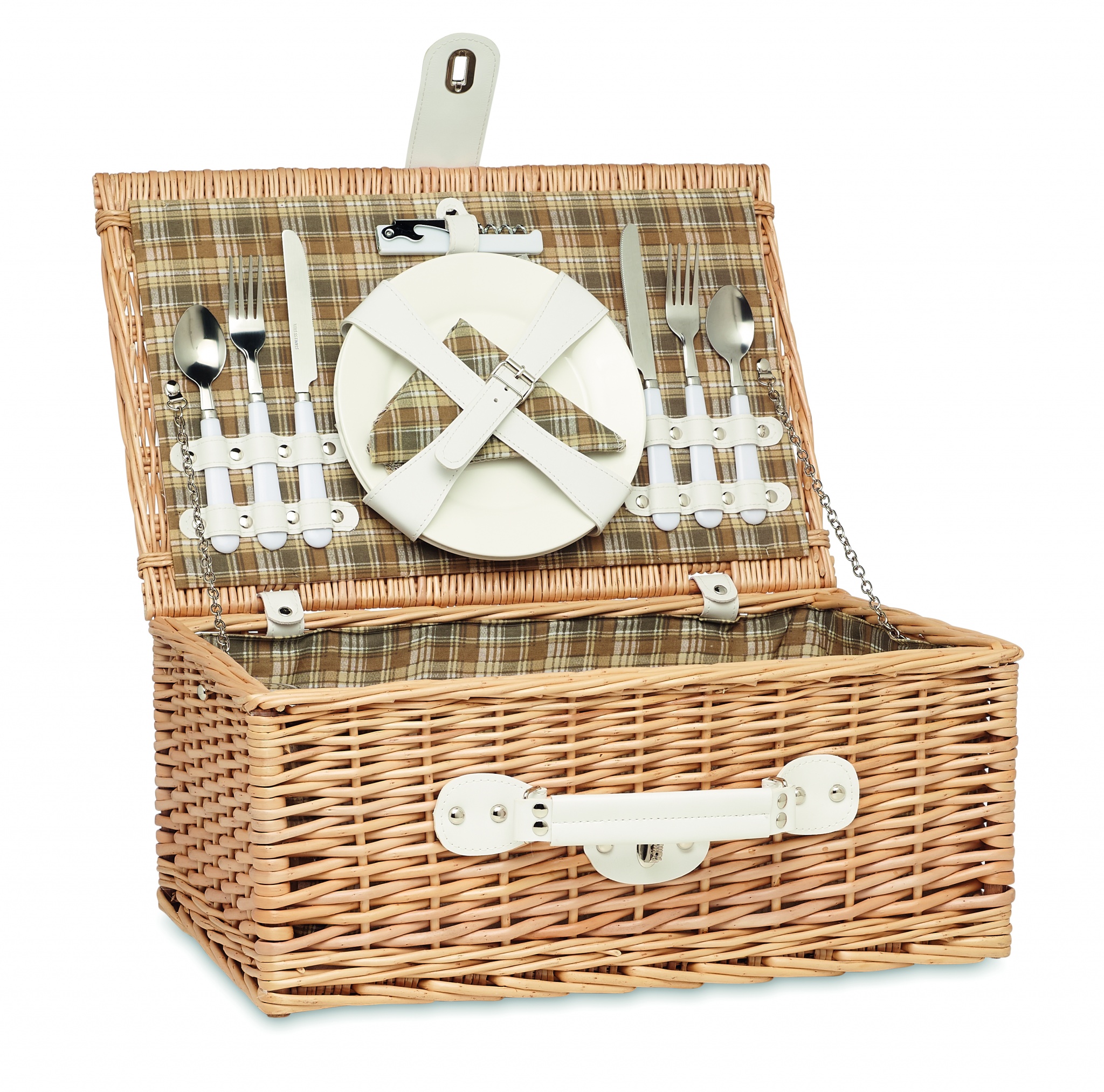 Punutud 2 inimese piknikukorvi komplekt 1 pudeliavaja, 2 roostevabast terasest lusika, kahvli ja noaga, 2 keraamilise taldriku, 2 klaasi ja 2 puuvillasest salvrätikuga.