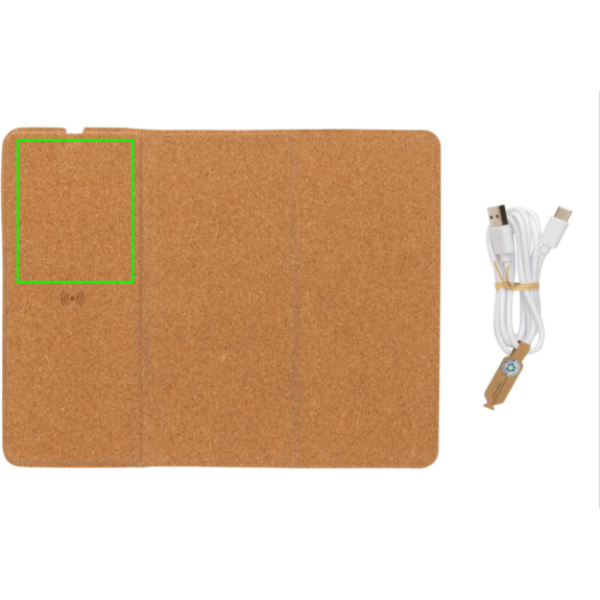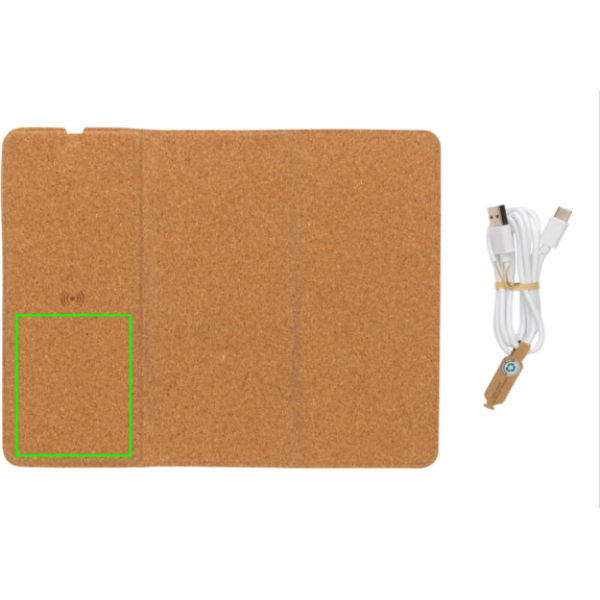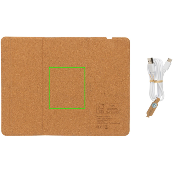 Langaton 10W lataava hiirimatto FSC 100% korkkiulkoasulla. Voidaan käyttää sekä hiirimattona että puhelintelineenä. Langaton lataus toimii kaikkien QI-yhteensopivien, kuten Androidin uusimpien sukupolvien, iPhone 8 ja uudempien, tuotteiden kanssa. Sisältää 120 cm tyypin C latauskaapelin, joka on valmistettu RCS sertifioidusta TPE:stä. Pakattu FSC® sekoituksesta valmistettuun kraft pakkaukseen. Tyyppi C tulovirta: 9V/2A; langaton lähtövirta: 9V/1.1A (10W)