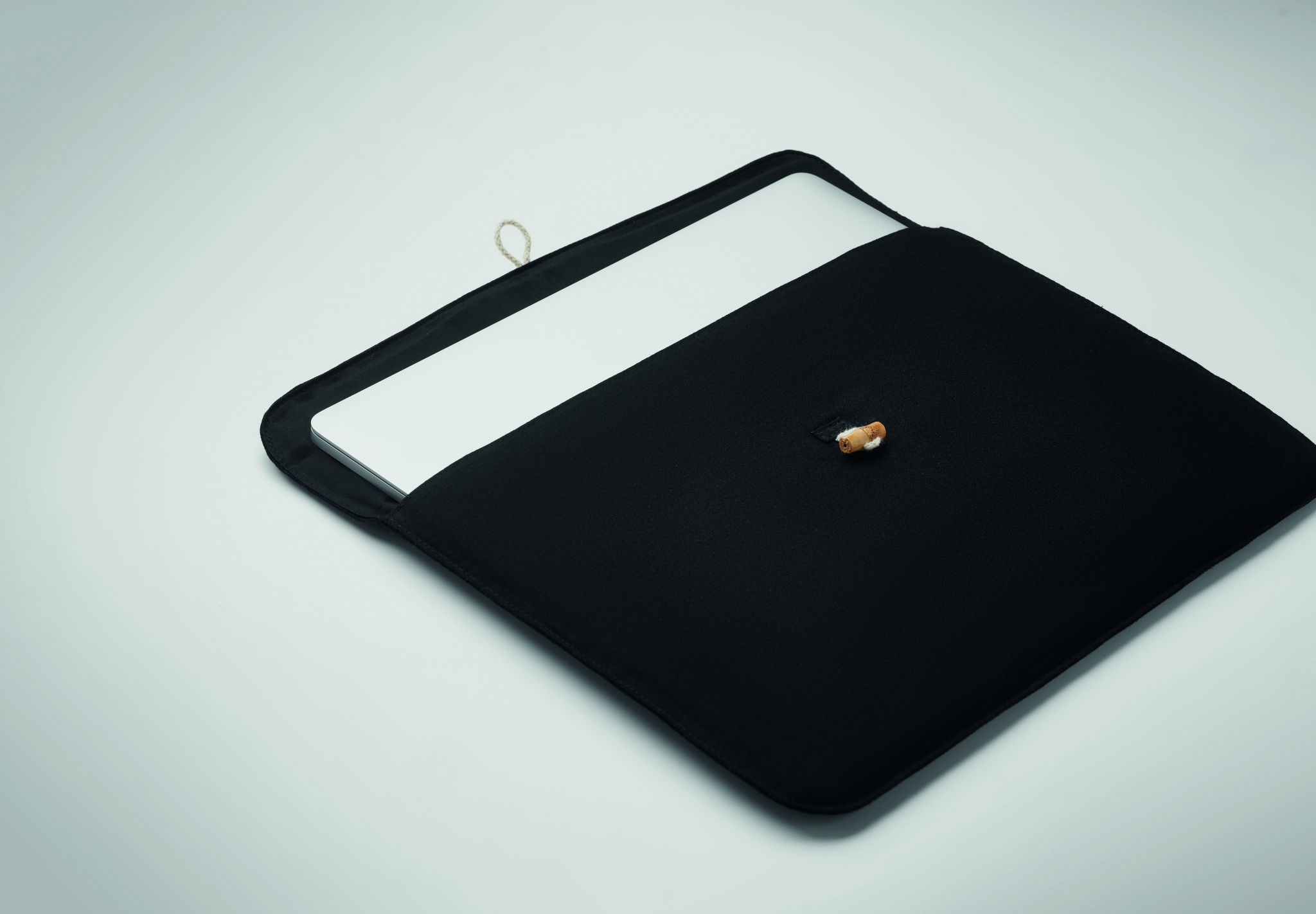 15 tuuman pehmustettu kannettavan tietokoneen laukku, puuvillaa, 220 gr/m². Sisävuori 120 gr/m². Bambunappisuljenta.