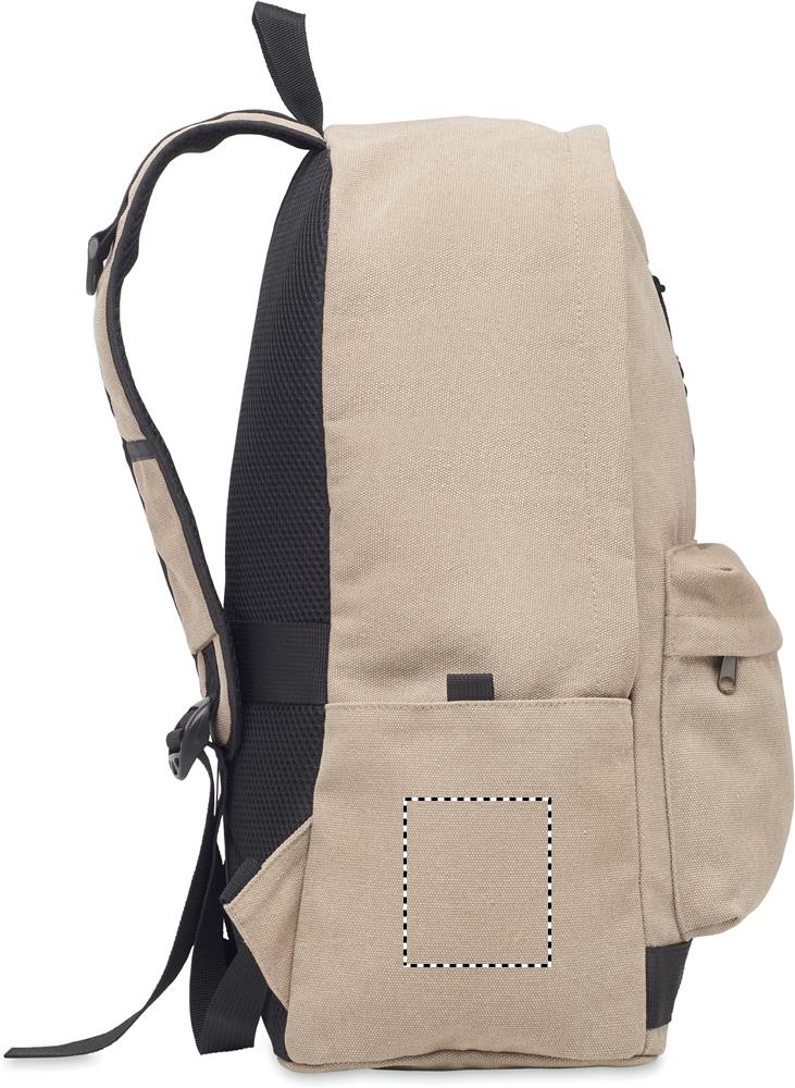 15 tuuman kannettava reppu kierrätetystä esikulutetusta puuvillasta. Suuri vetoketjullinen etutasku, jossa on sisäinen kannettava tietokoneen lokero. Pieni vetoketjullinen etutasku. Kaksi sivutaskua. Pehmustetut selkä- ja olkahihnat, selkäpaneeli ja pohja. 450 gr/m².