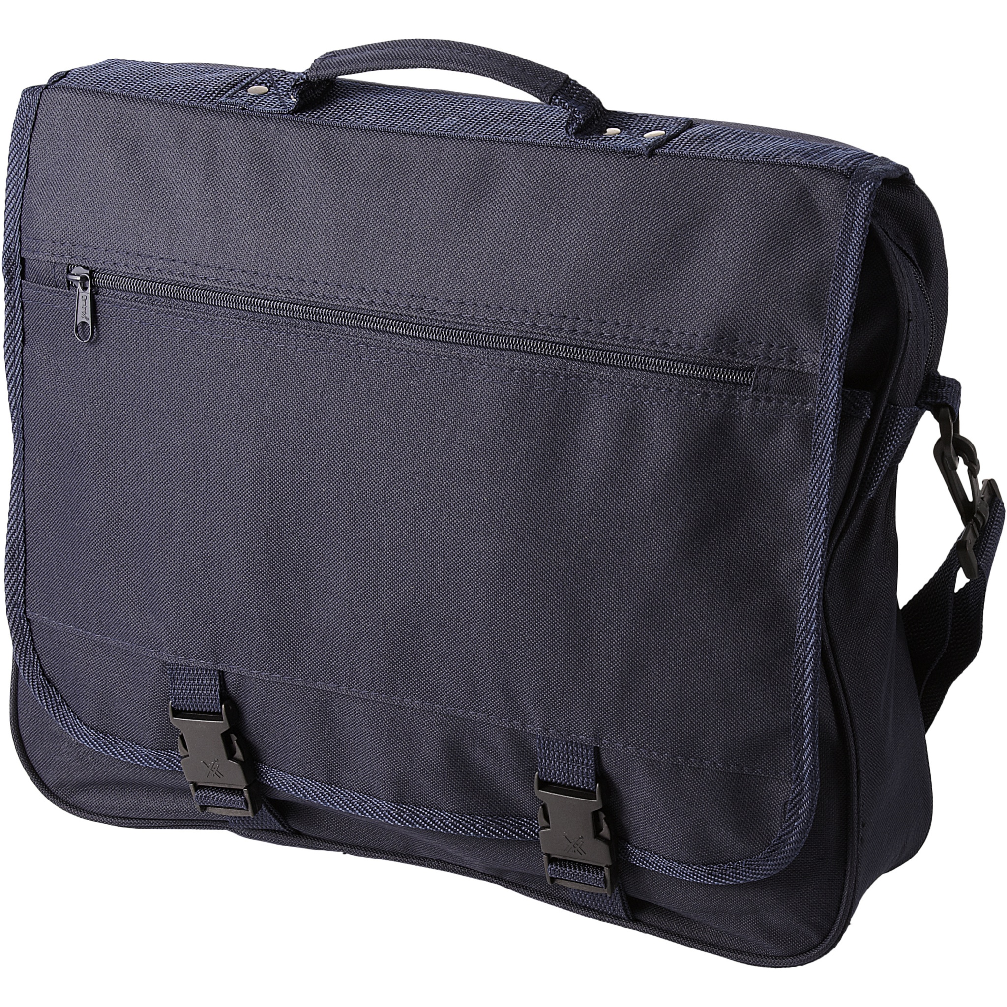 Laukku, jossa on säädettävä olkahihna, kiinnityssolki, läpässä vetoketjullinen tasku, vetoketjullinen säilytyslokero ja läpän alla useita avoimia taskuja.