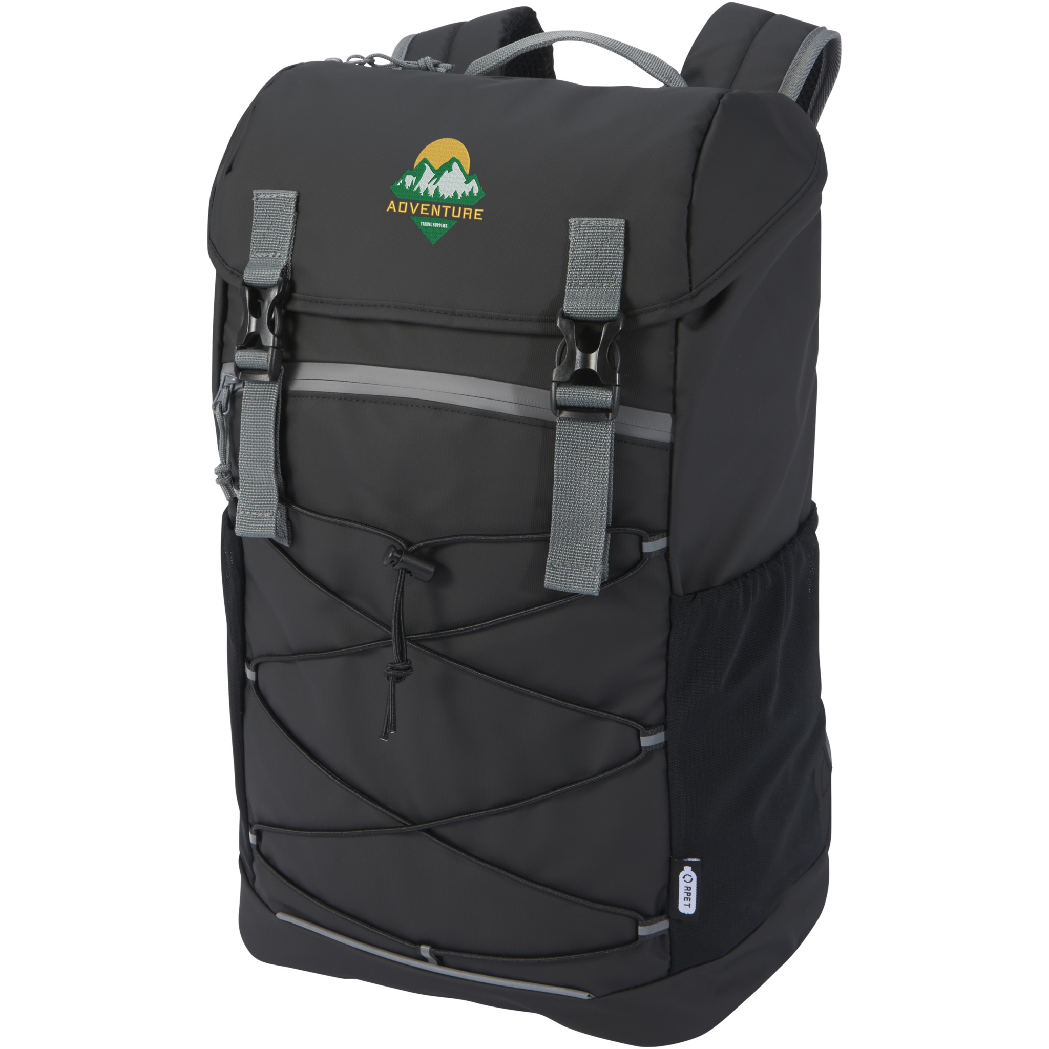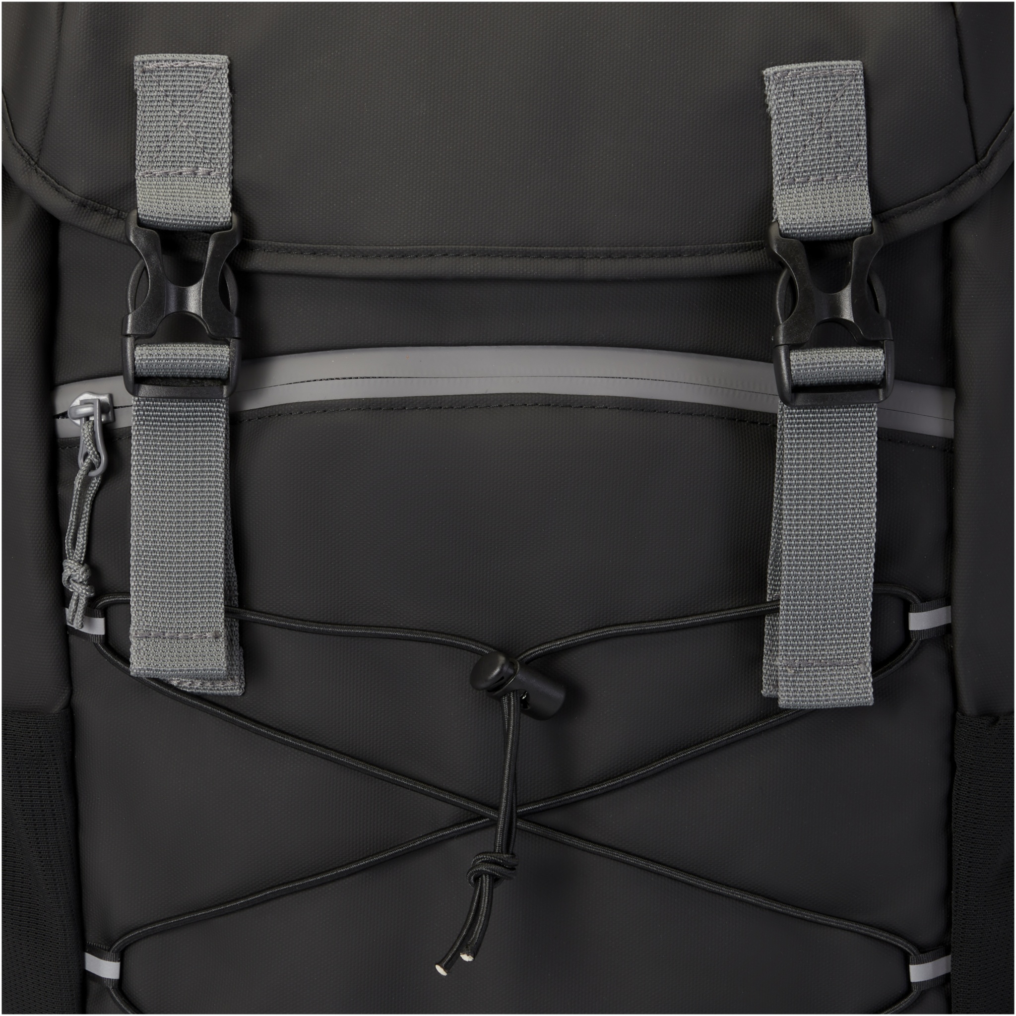 Vedenkestävä reppu kannettavalle tietokoneelle. Repun osat, mukaan lukien vetoketjut, on valmistettu GRS-sertifioiduista kierrätysmateriaaleista. Repussa on tilava lokero 15,6-tuumaiselle kannettavalle tietokoneelle, kiristysnyöri ja säädettävät soljet, jotka maksimoivat säilytystilan läppäkannen alla. Repussa on useita taskuja, kuten vetoketjullinen etutasku, jossa on joustavat kiristysnyörit tavaroiden säilytystä ja järjestyksessä pitämistä varten sekä heijastava kaistale näkyvyyttä varten. Pehmustetun selkäosan ja rinnan yli kulkevan säädettävän hihnan ansiosta reppua on mukava kantaa silloinkin, kun se on täynnä. Repun kangas, vuori, nauha ja vetoketjut on valmistettu GRS-kierrätysmateriaaleista. Tilavuus: 23 litraa. PVC-vapaa.