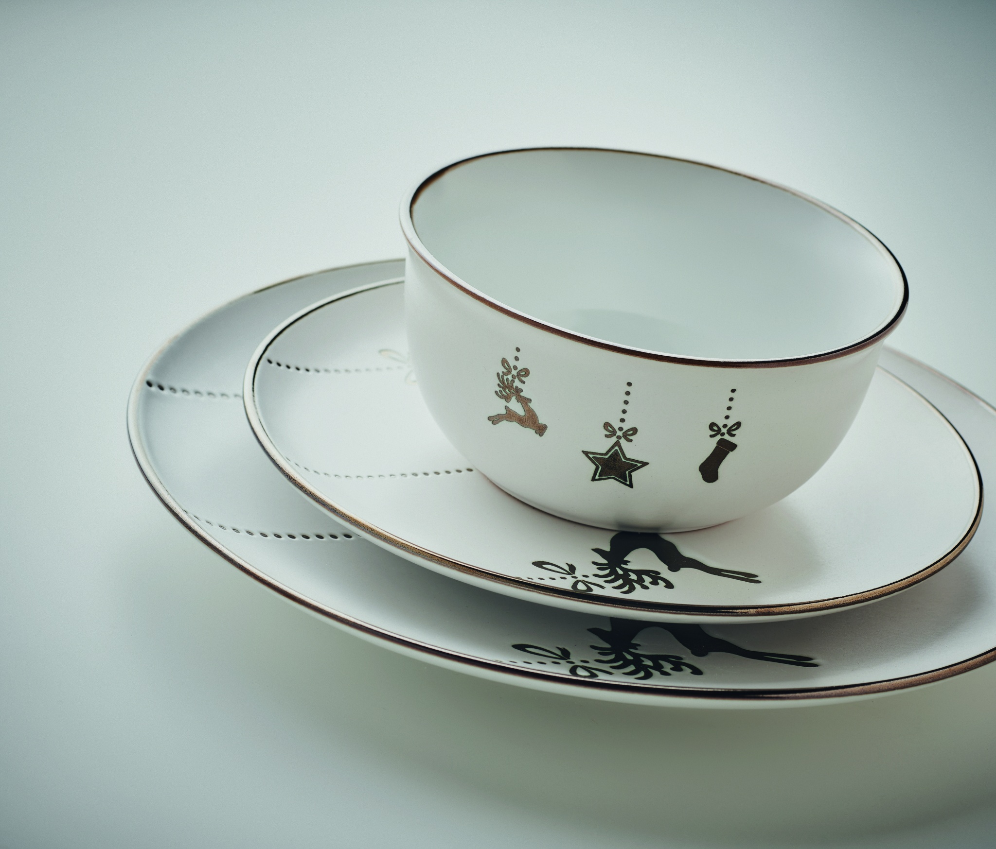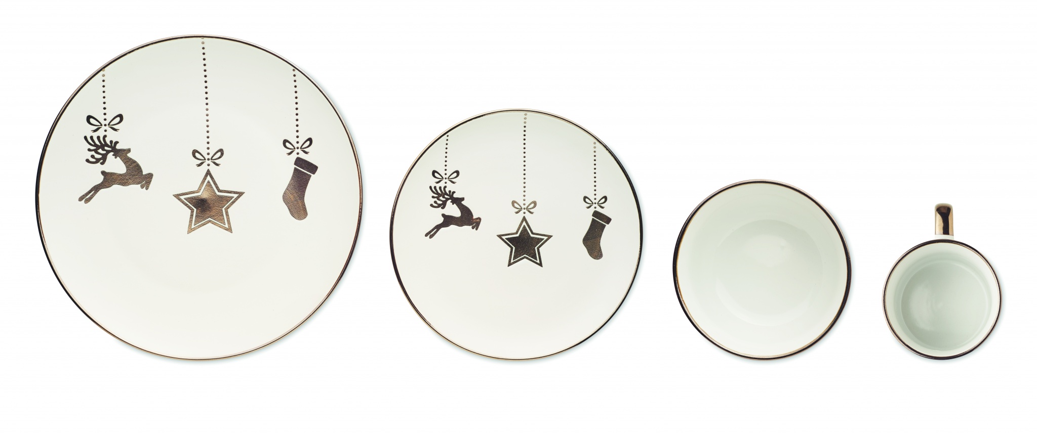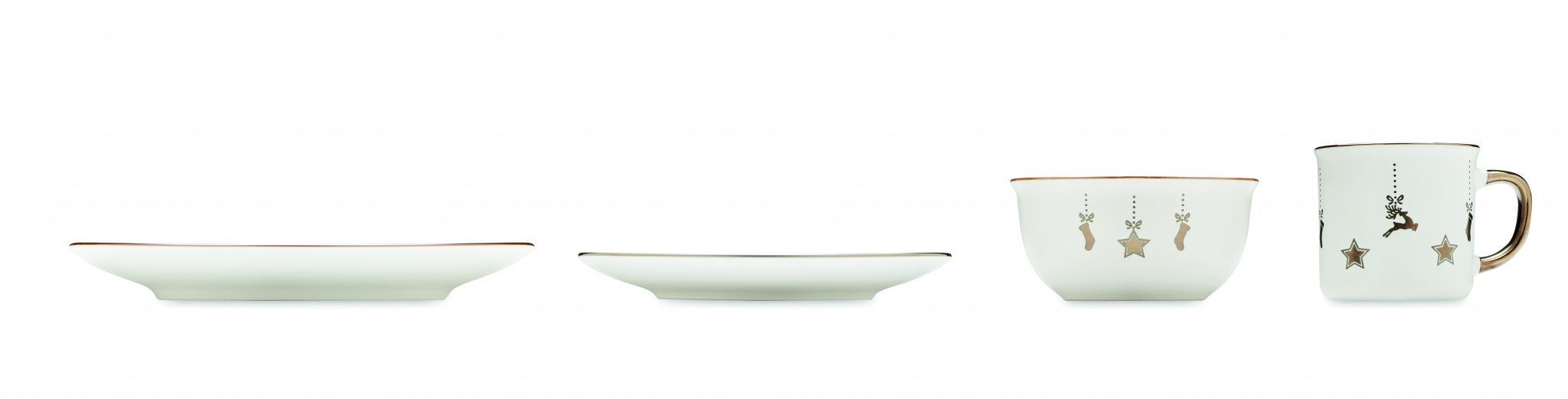 Jouluinen 4-osainen keraaminen astiasto, sisältää ruokalautasen, aamiaislautasen, salaattikulhon (500 ml) ja mukin (300 ml). Pakattuna lahjapakkaukseen.