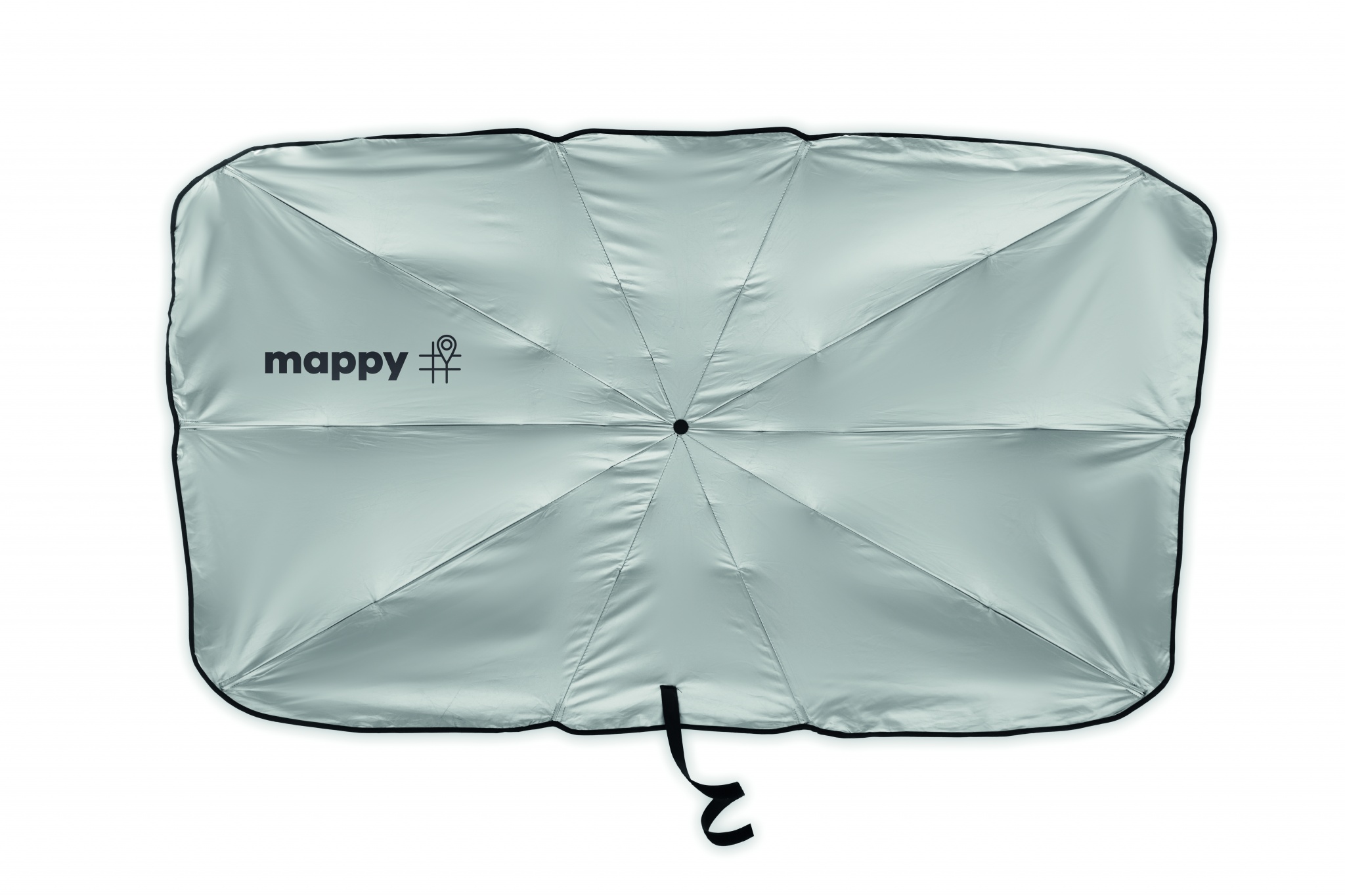 Tuulilasin aurinkovarjo 190T pongee-materiaalista, jossa on toisella puolella. Manuaalinen avaaminen/sulkeminen.