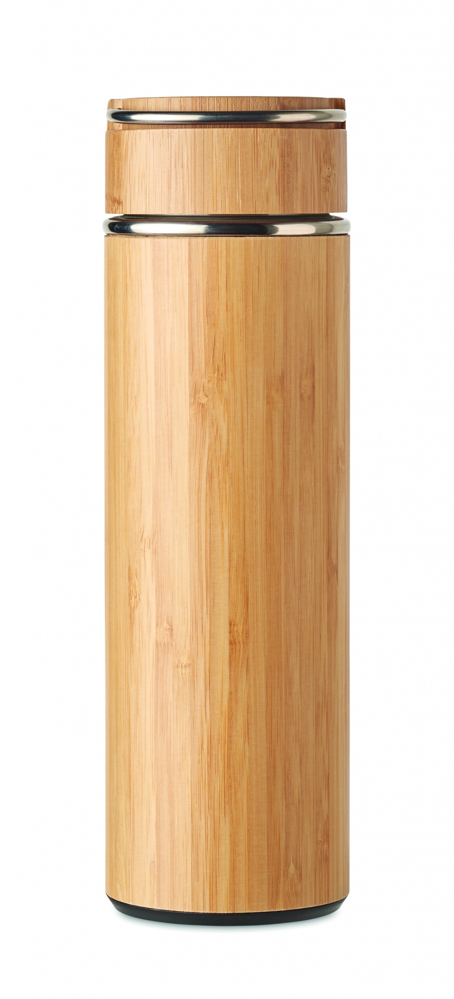 Kaksiseinäinen 400 ml ruostumattomasta teräksestä valmistettu termospullo, bambu kuorella ja teesiivilällä. Tuote on vuoto vapaa. Luonnollisen materiaalin (bambu) vuoksi, tuotteiden värissä/ koossa saattaa olla erinäisyyksiä ja tämä voi vaikuttaa painatuksen lopputulokseen.