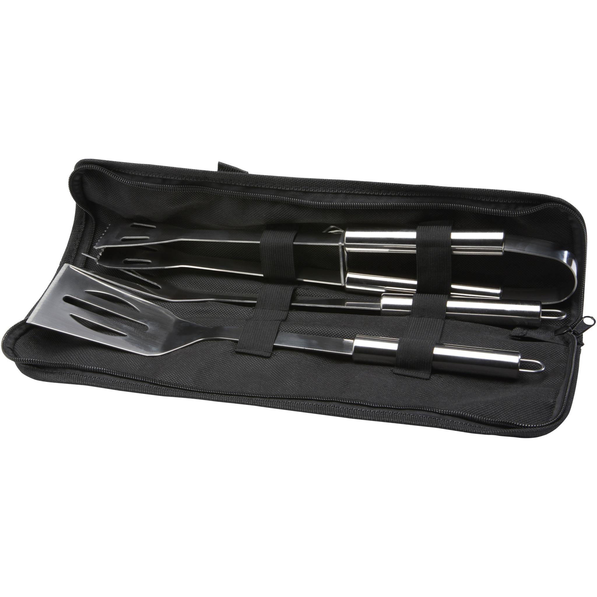3-osainen grillausvälinesarja, jossa on lasta (34,8 x 7,5 cm), haarukka (35,4 x 3,35 cm) ja pihdit (35 x 6,8 x 4 cm). Grillausvälineet toimitetaan kevyessä kotelossa, jossa niitä on helppo säilyttää ja kuljettaa. Tämä on erinomainen grillaustarvikesarja kotipihalle tai mukaan vietäväksi, kun grillaat ulkona ystävien ja perheen kanssa.