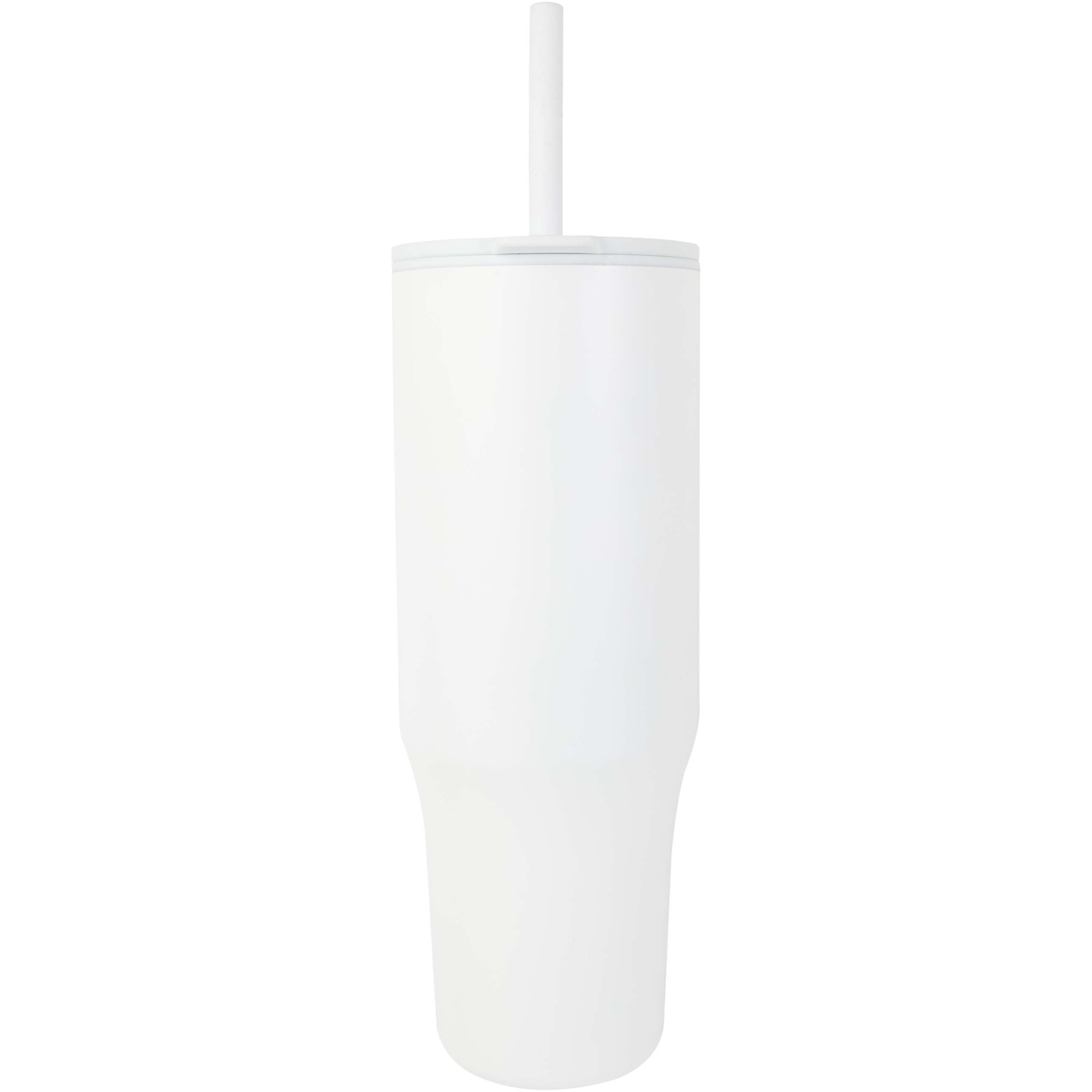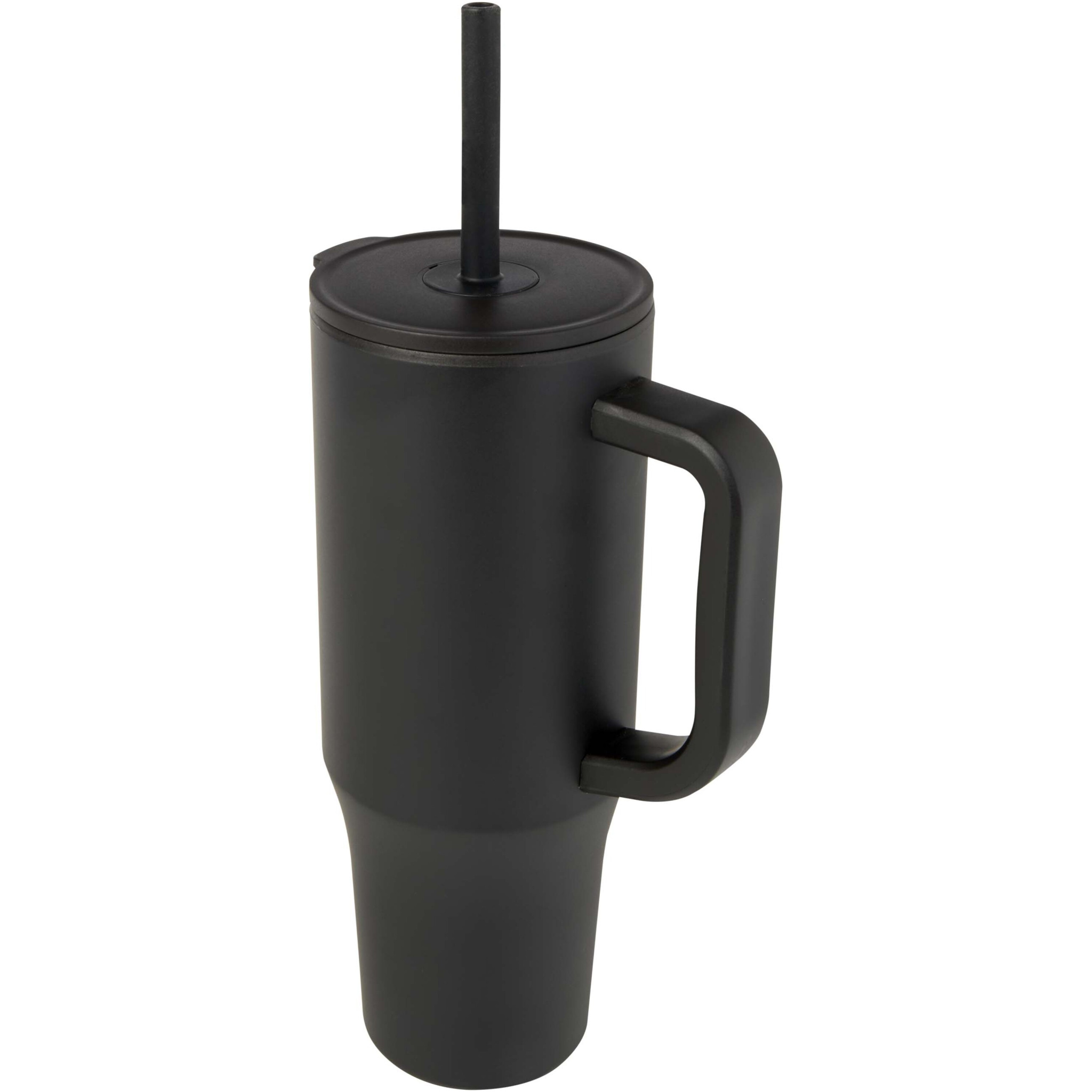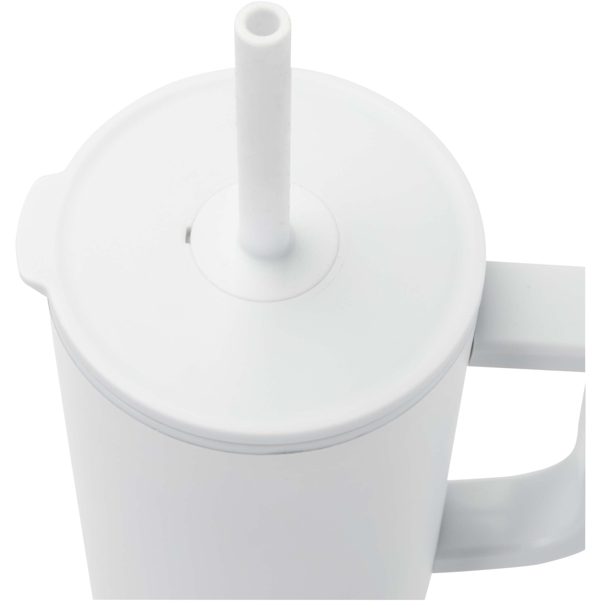 Juomamuki, jossa on kestävä ulkoseinä RCS-sertifioidusta kierrätetystä ruostumattomasta teräksestä ja sisäseinä muovista. Mukana on integroitu elintarvikelaatuinen silikonipilli ja roiskeenkestävä painettava kansi juomisen helpottamiseksi. Tämä muki sopii myös kuumille juomille, mutta niitä ei suositella juotavaksi pillillä. Jäähdytä juoma poistamalla kansi ennen nauttimista. Tilavuus: 900 ml. Käsinpesu.