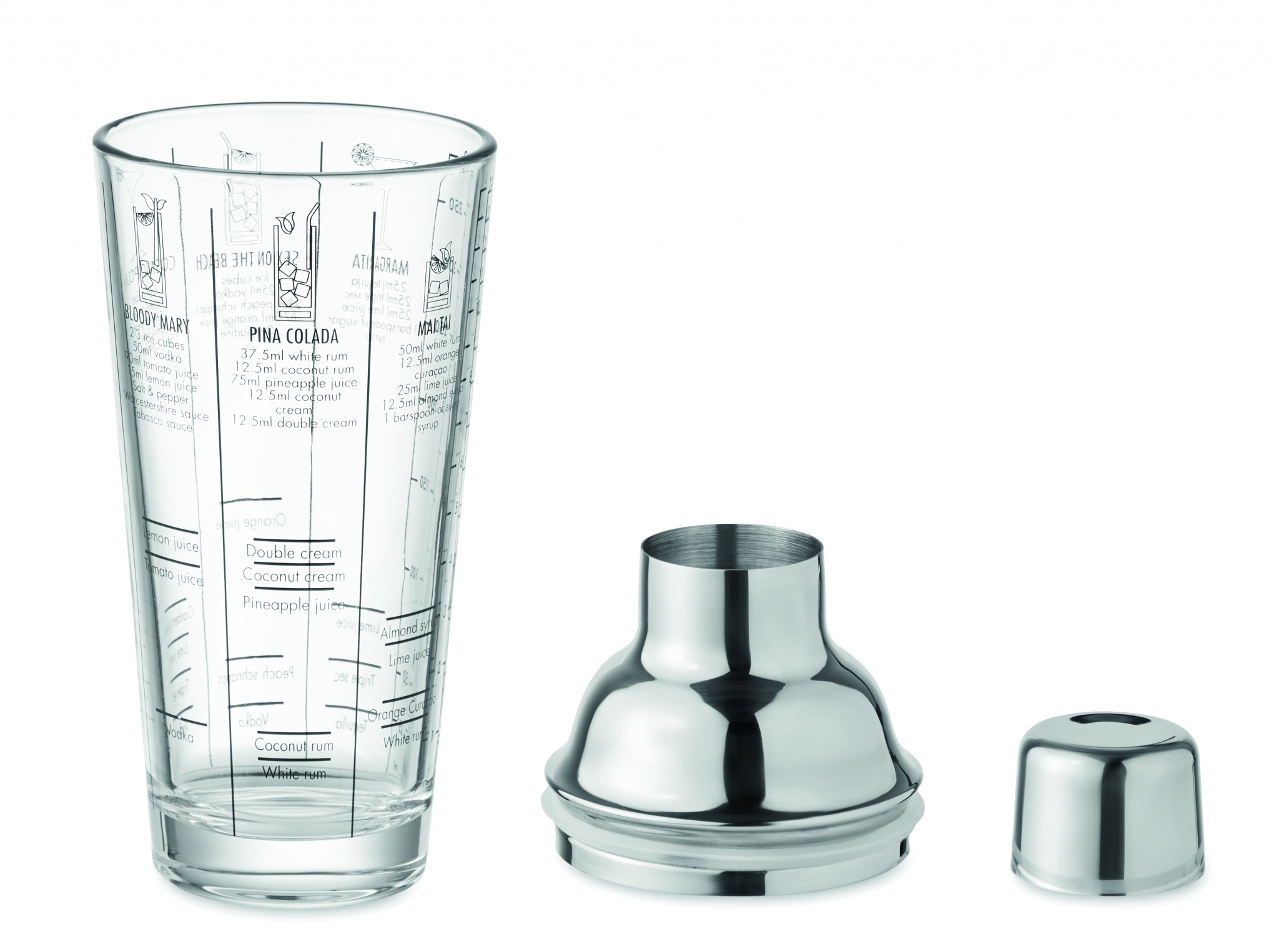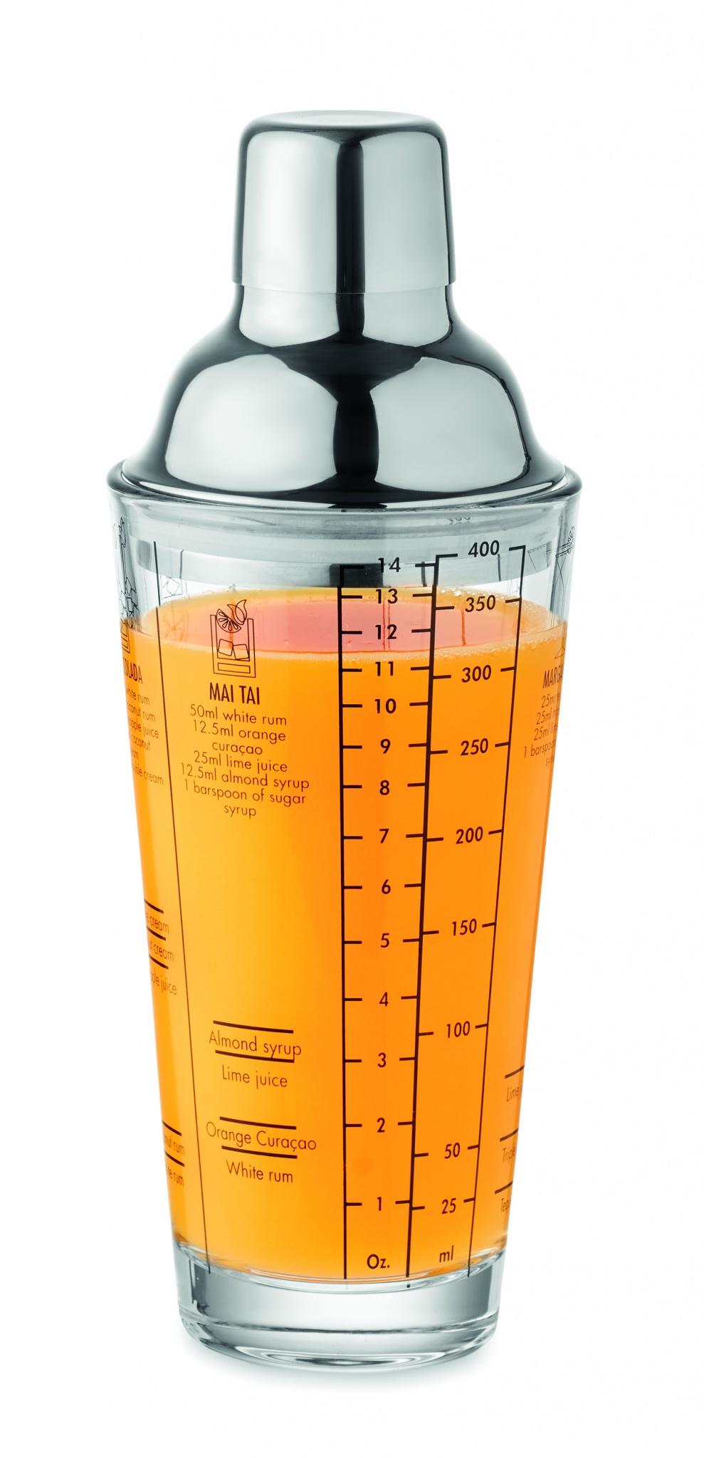 Lasinen cocktail-shaker, jossa on ruostumattomasta teräksestä valmistettu kansi ja lasiin painetut cocktailreseptit ja mittatiedot. Tilavuus: 400 ml.