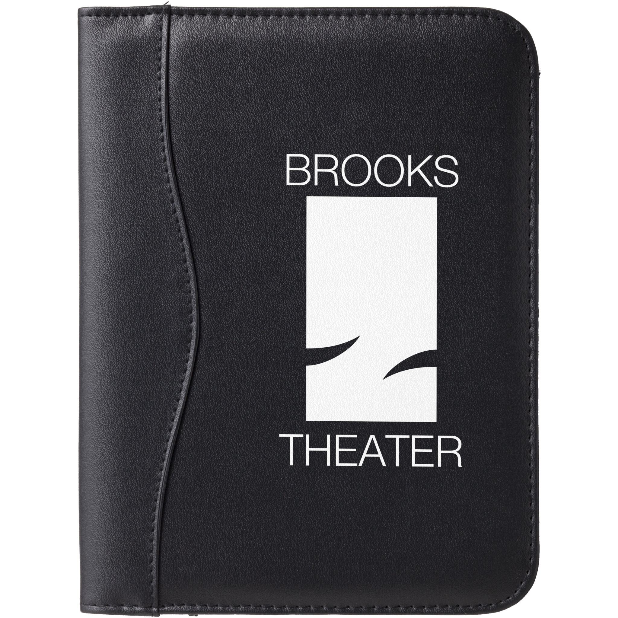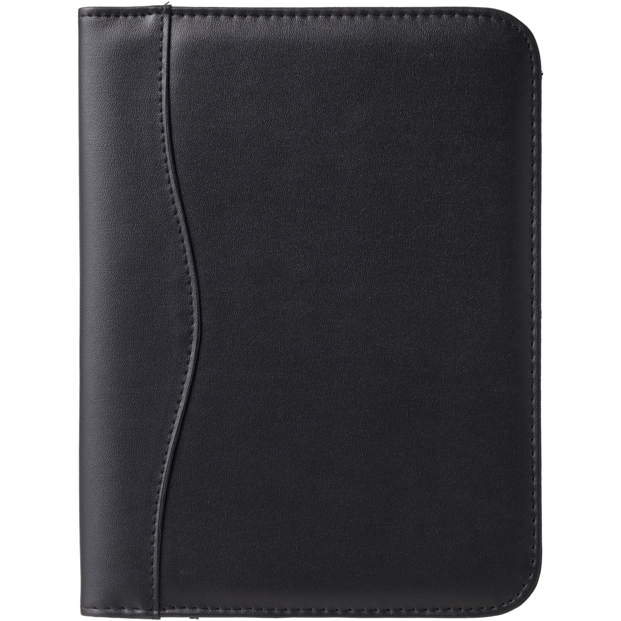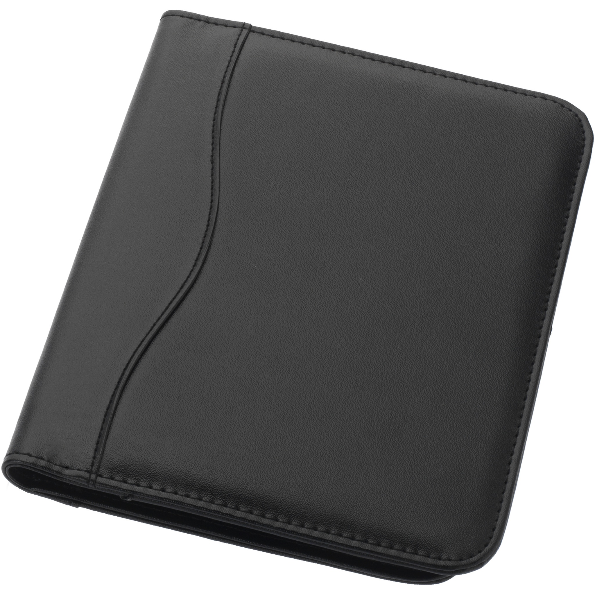 Kansiossa on kynälenkki, asiakirjataskut ja 20 viivoitettua muistipaperia. Kynä ja tarvikkeet rekvisiittaa.