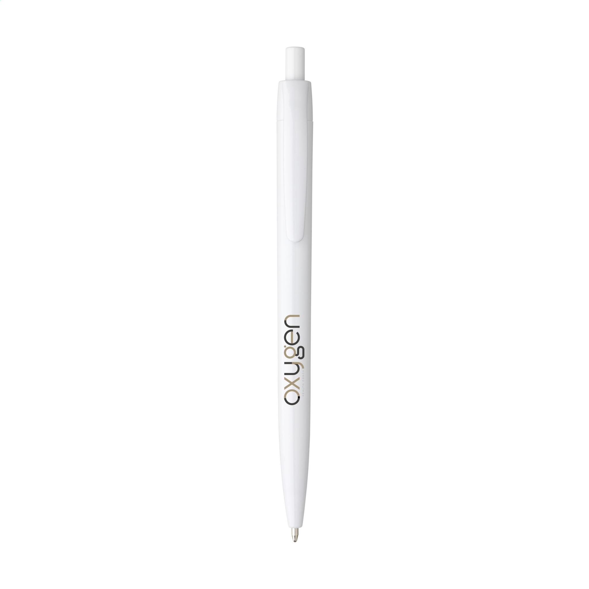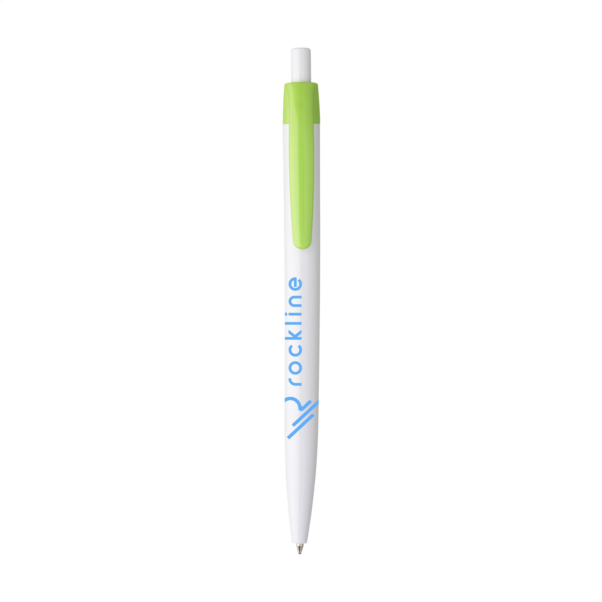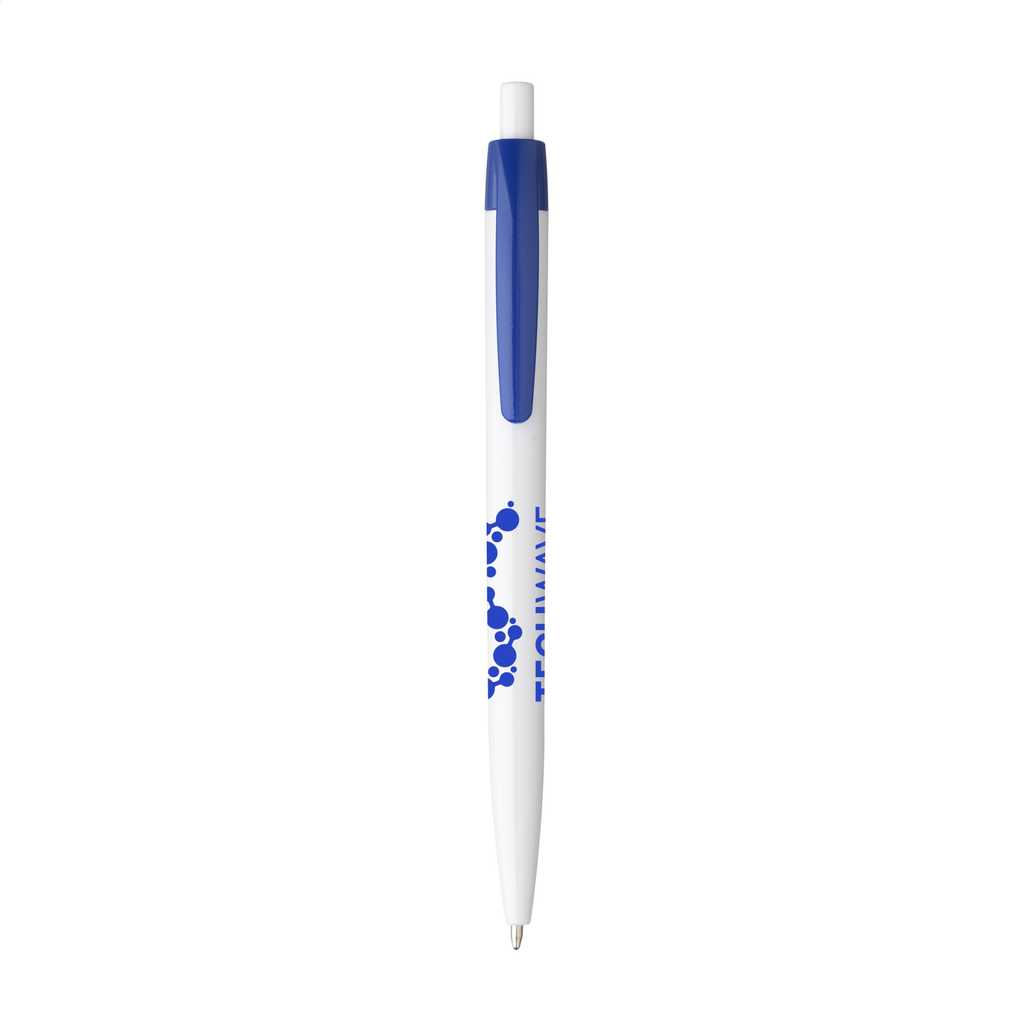 Yksiosainen kuulakärkikynä, jossa sininen muste ja valkoinen piippu. Tässä kynässä on suuri tulostusalue optimaalista tuotemerkkiä varten sekä silmiinpistävä, värillinen klipsi.