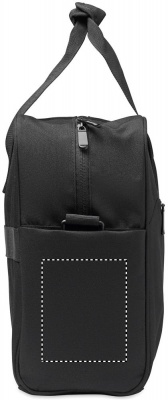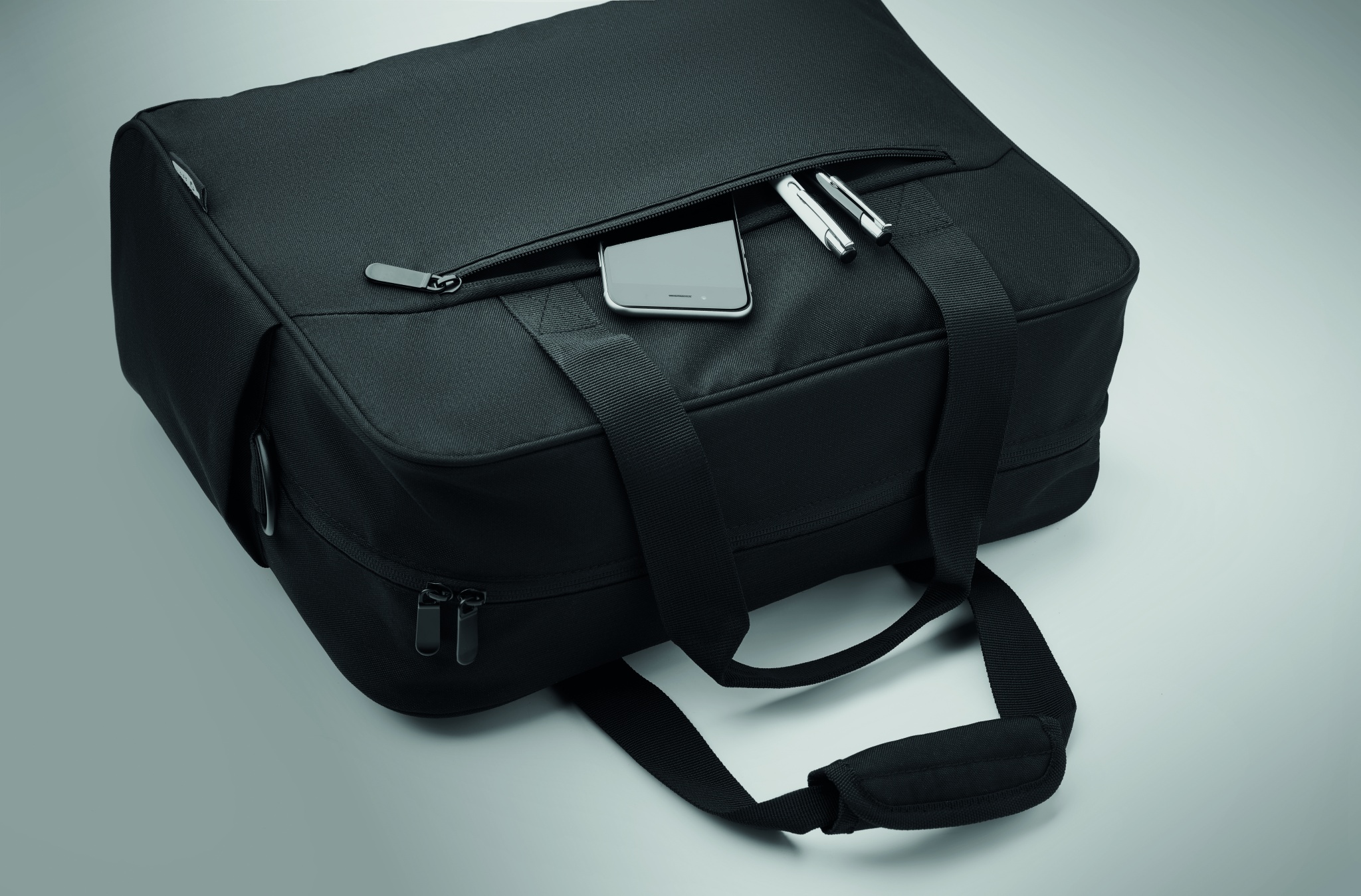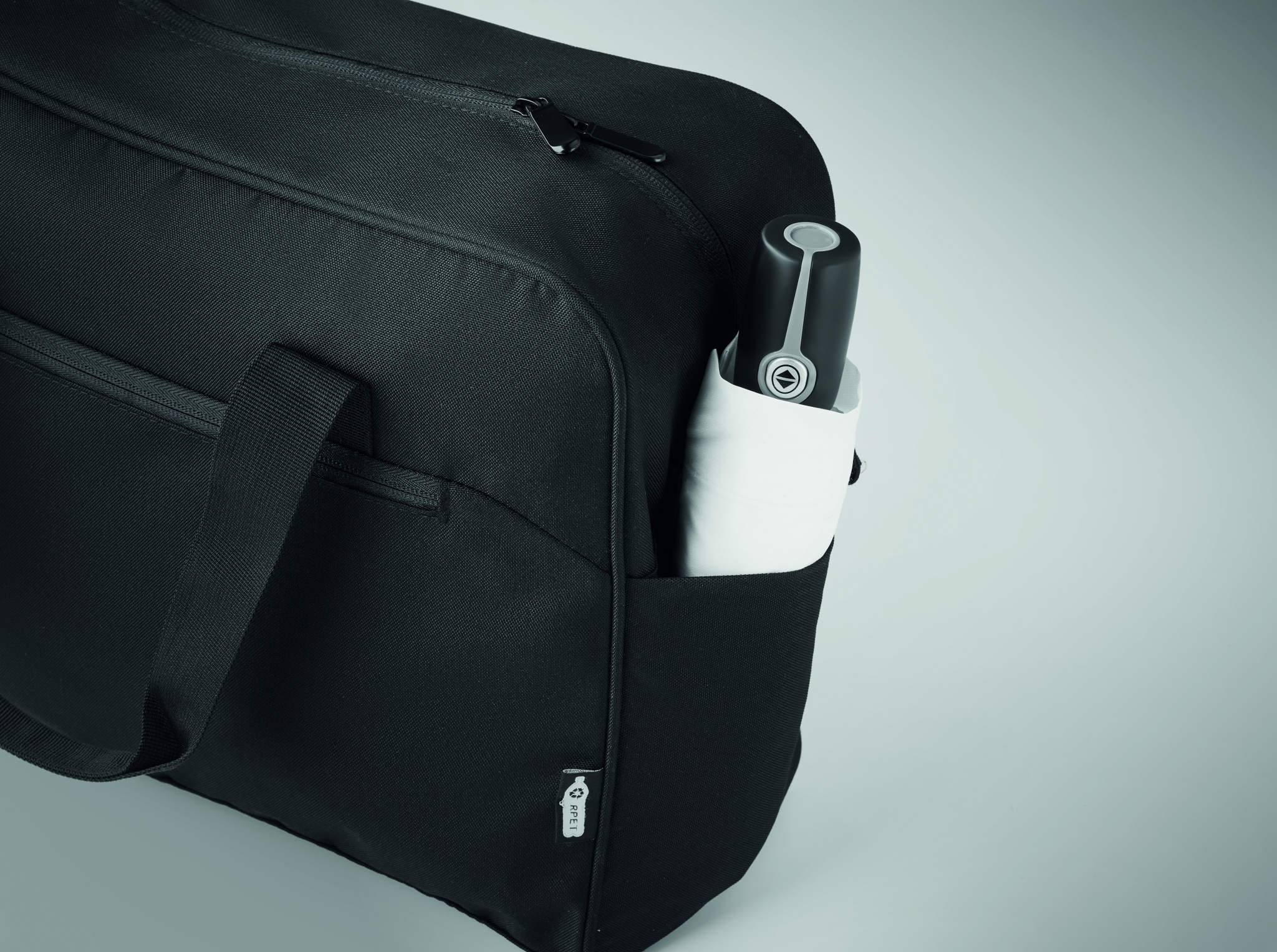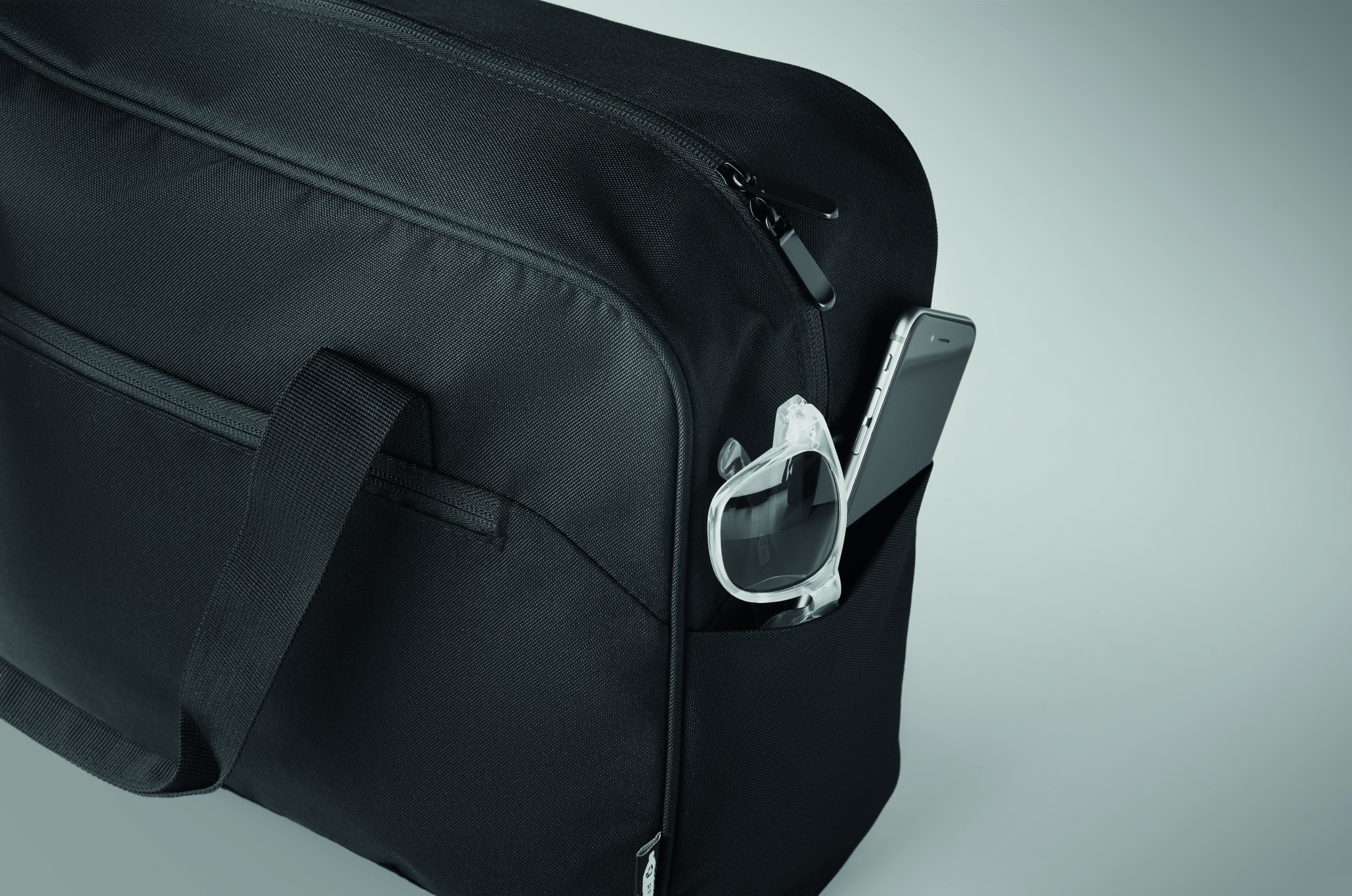 Käsimatkatavaralaukku 600D RPET:stä, jossa on suuri vetoketjullinen etutasku, kaksi pientä sivutaskua. Sisältää 15 tuuman kannettavan tietokoneen lokeron. Pehmustettu irrotettava ja säädettävä olkahihna. Trolleypidike kääntöpuolella.